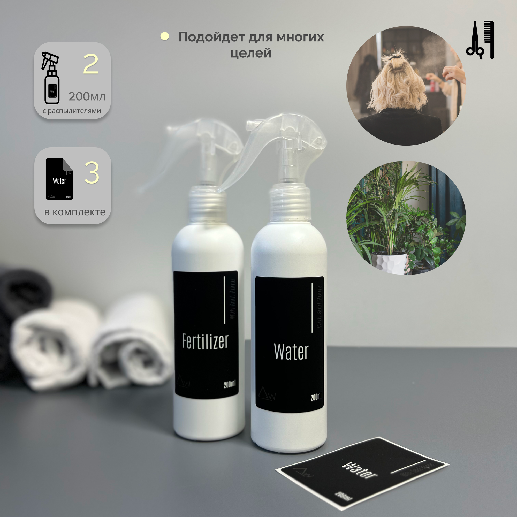 | Комплектация | - Флакон прозрачный 200мл - 2 шт. Наклейки 3 штуки: - Этикетка черная Water- 2 шт. - Этикетка черная Fertilizer- 1 шт. - Распылитель -2 шт. |
