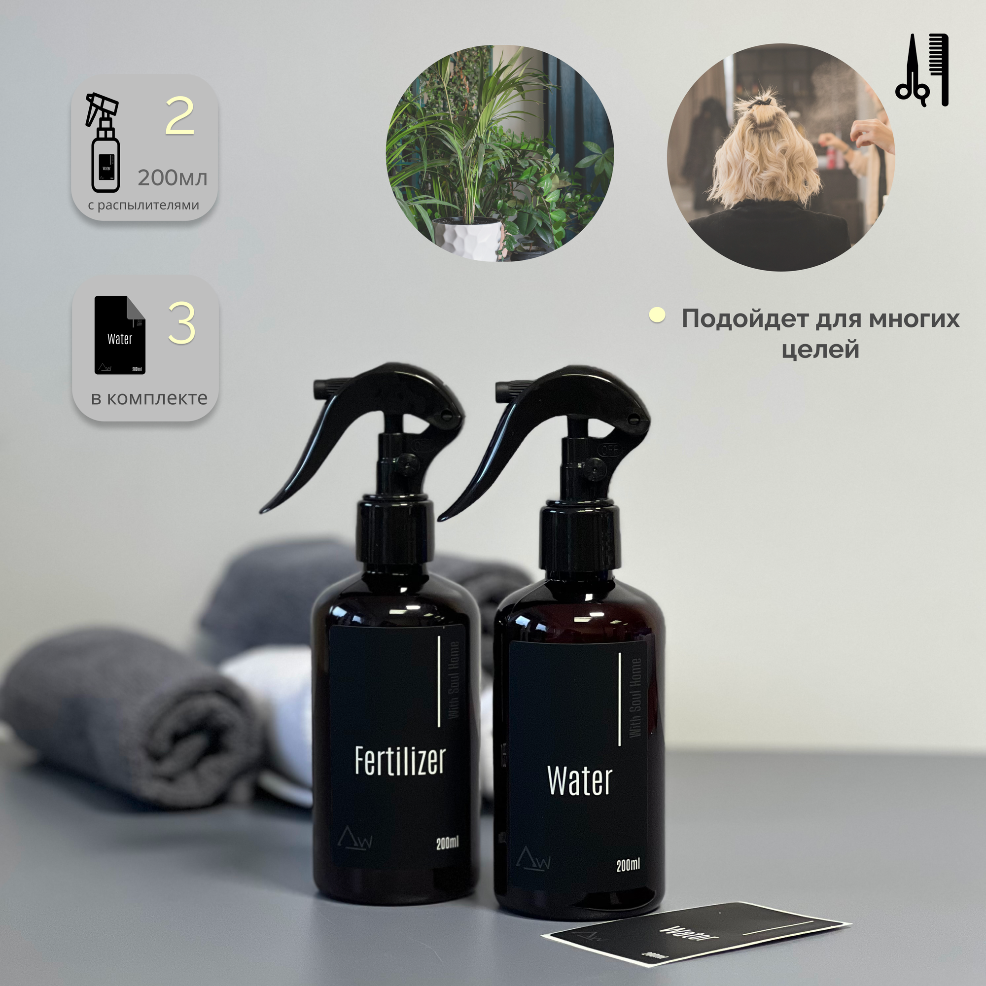 | Комплектация | - Флакон прозрачный 200мл - 2 шт. Наклейки 3 штуки: - Этикетка черная Water- 2 шт. - Этикетка черная Fertilizer- 1 шт. - Распылитель -2 шт. |