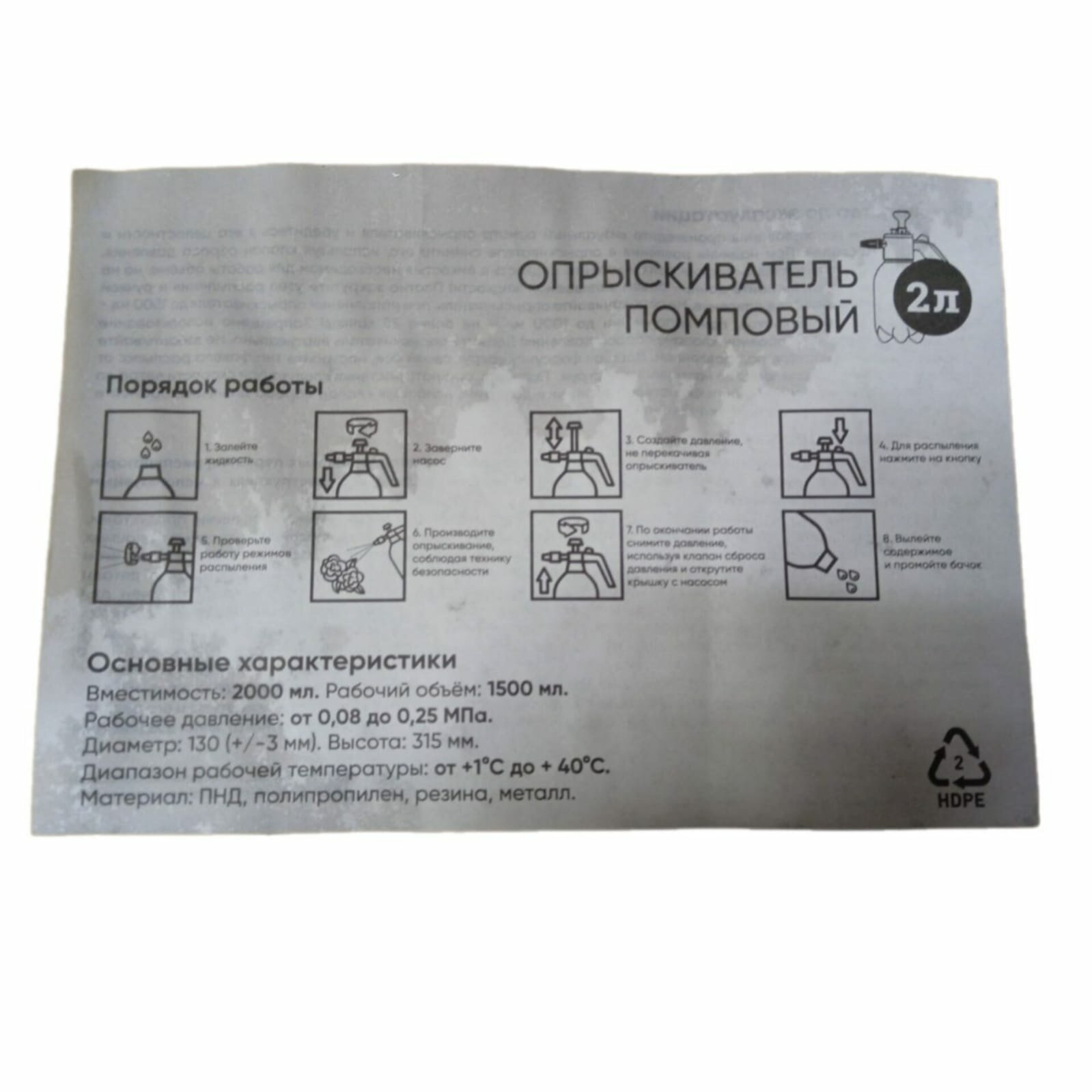 | Комплектация | Опрыскиватель 2 литра с Предохранительным клапаном -1шт |