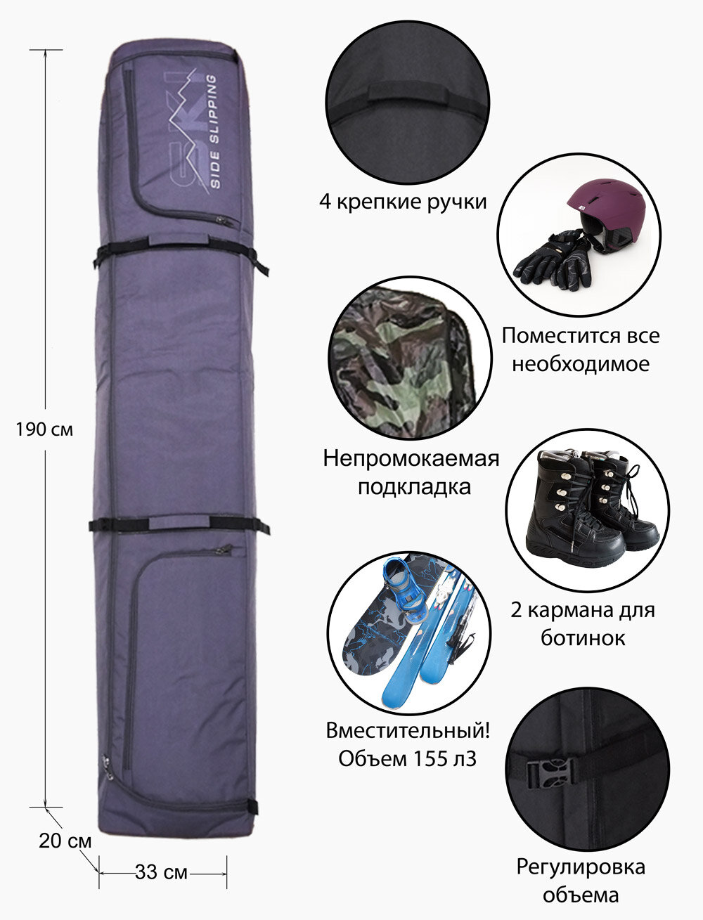| Особенности | влагонепроницаемый / для двух пар лыж / для двух сноубордов / жесткий каркас / регулировка длины / с колесами |