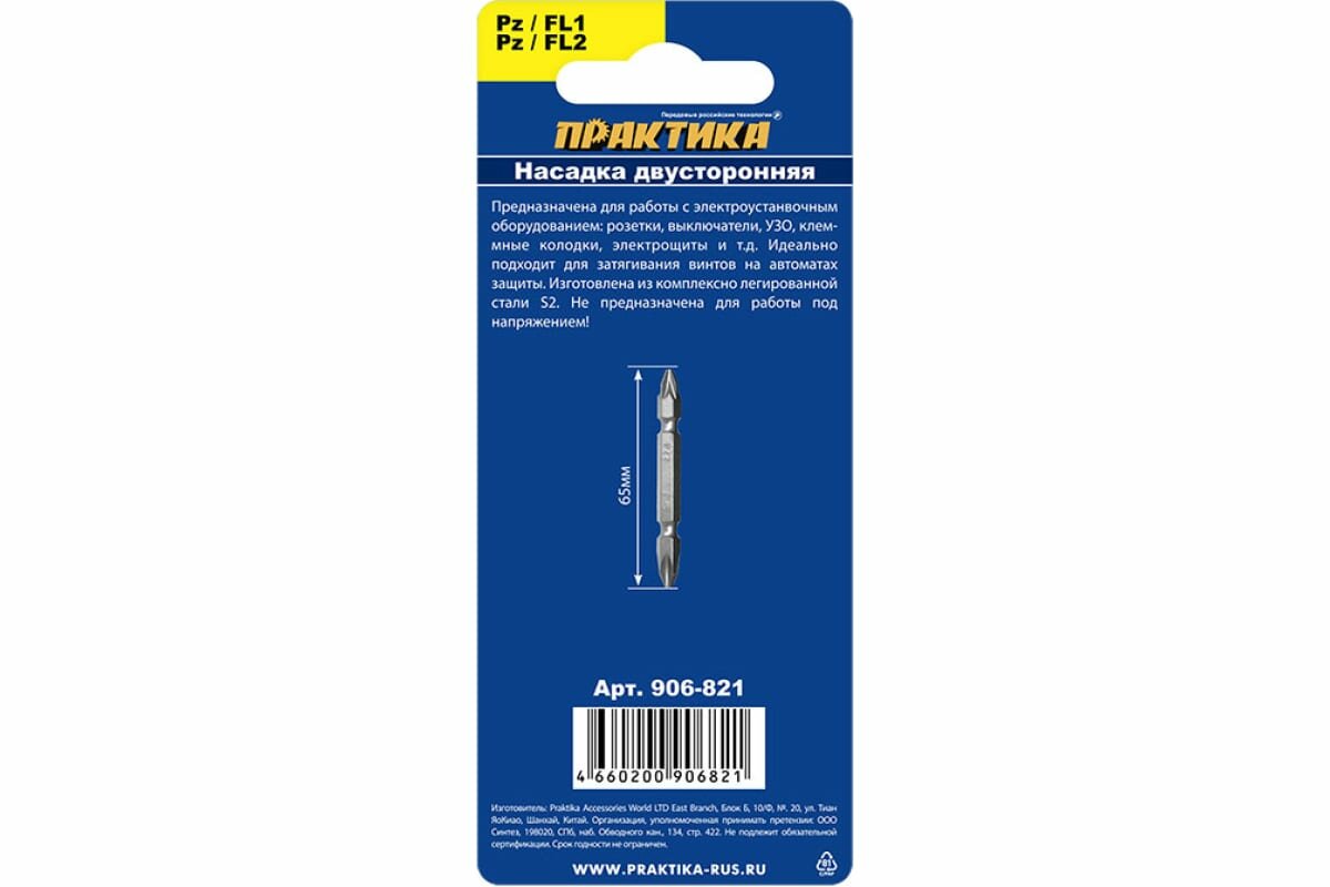 ПРАКТИКА Бита отверточная "Профи" двусторонняя PZ/FL1-PZ/FL2x65мм 2шт для электротехнич. работ 906-821