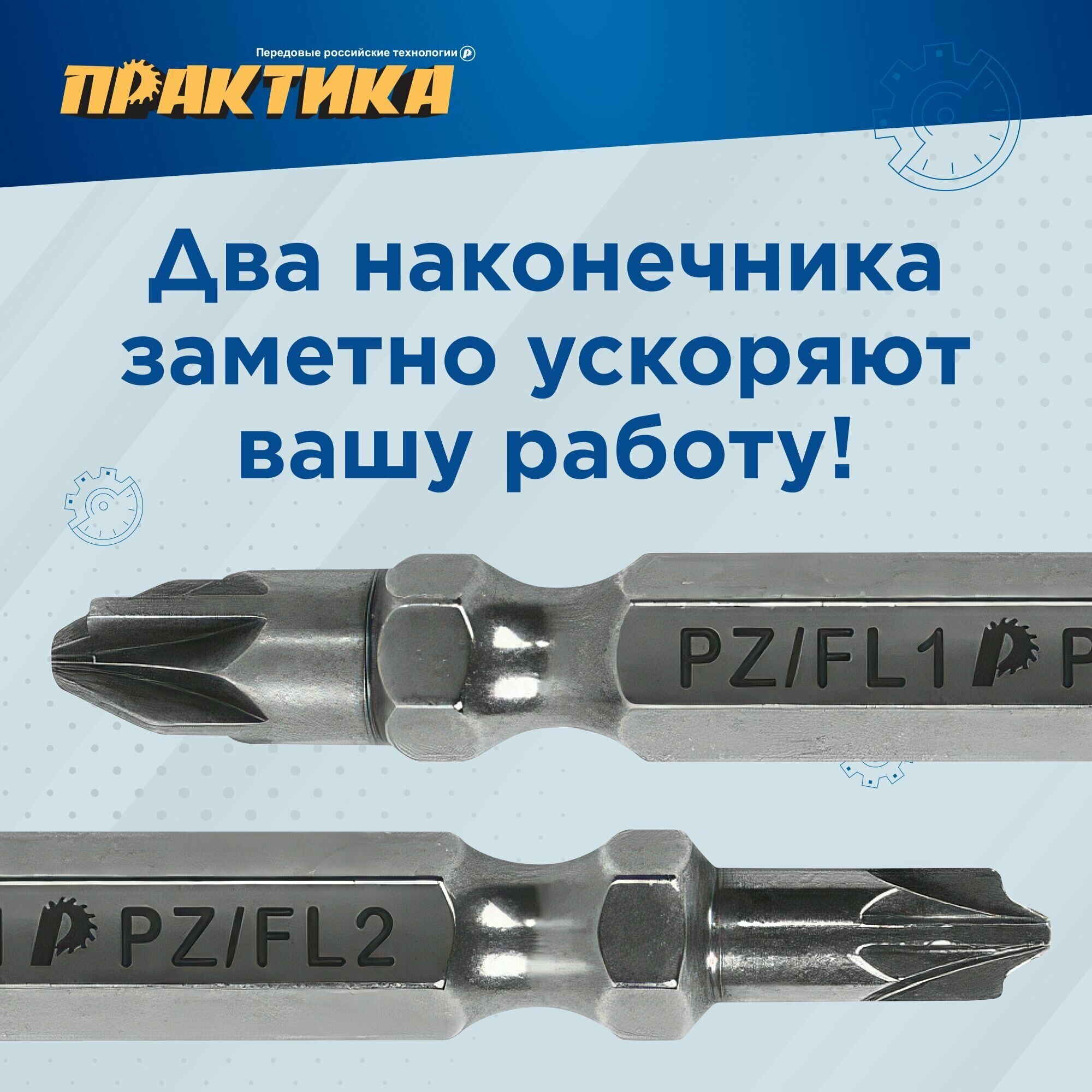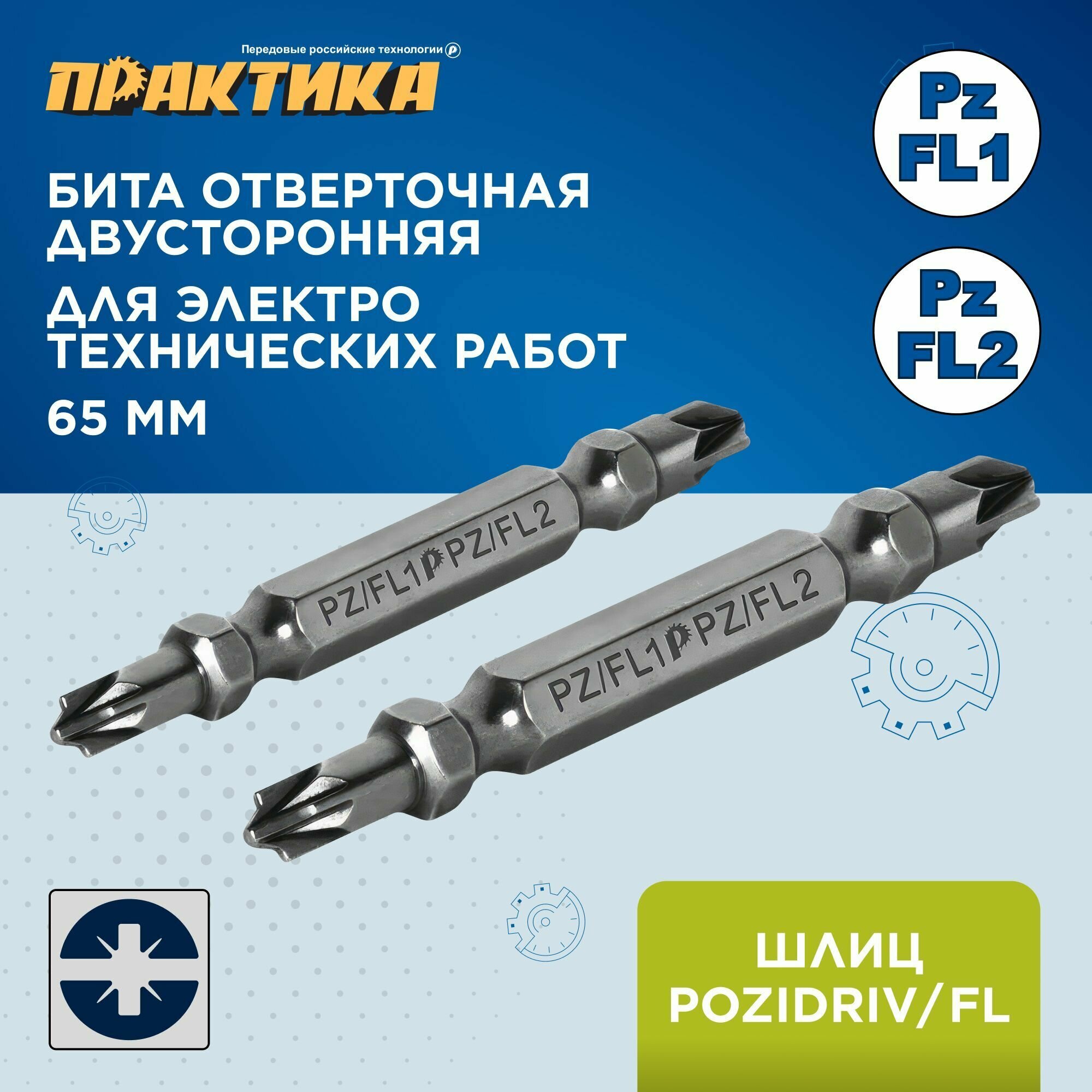 Биты для шуруповерта/биты отверточные PZ/FL1-PZ/FL2 х 65мм ПРАКТИКА Профи двусторонние для электротехнических работ 2 шт