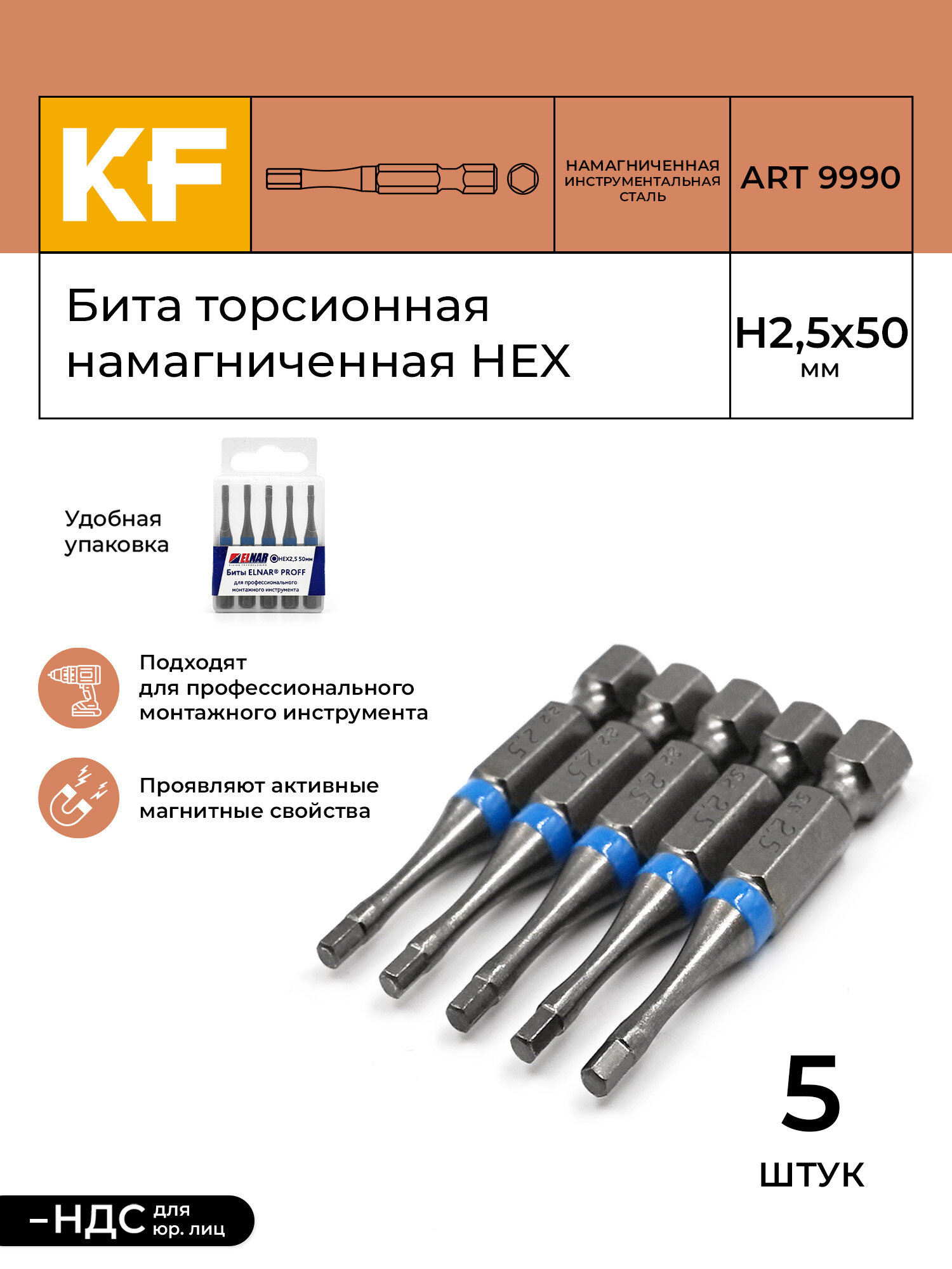 Бита для шуруповерта торсионная КF 9990 HEX H2,5х50 намагниченная 5 шт. интересное: