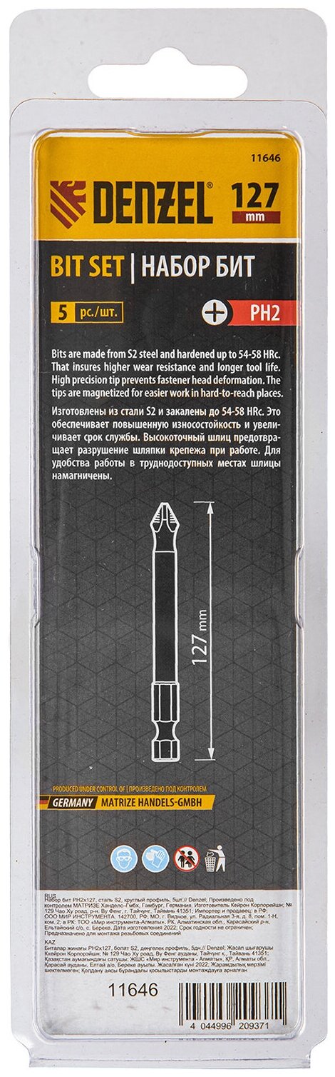 Набор бит Denzel PH2х127 сталь S2, круглый профиль, 5 шт 11646
