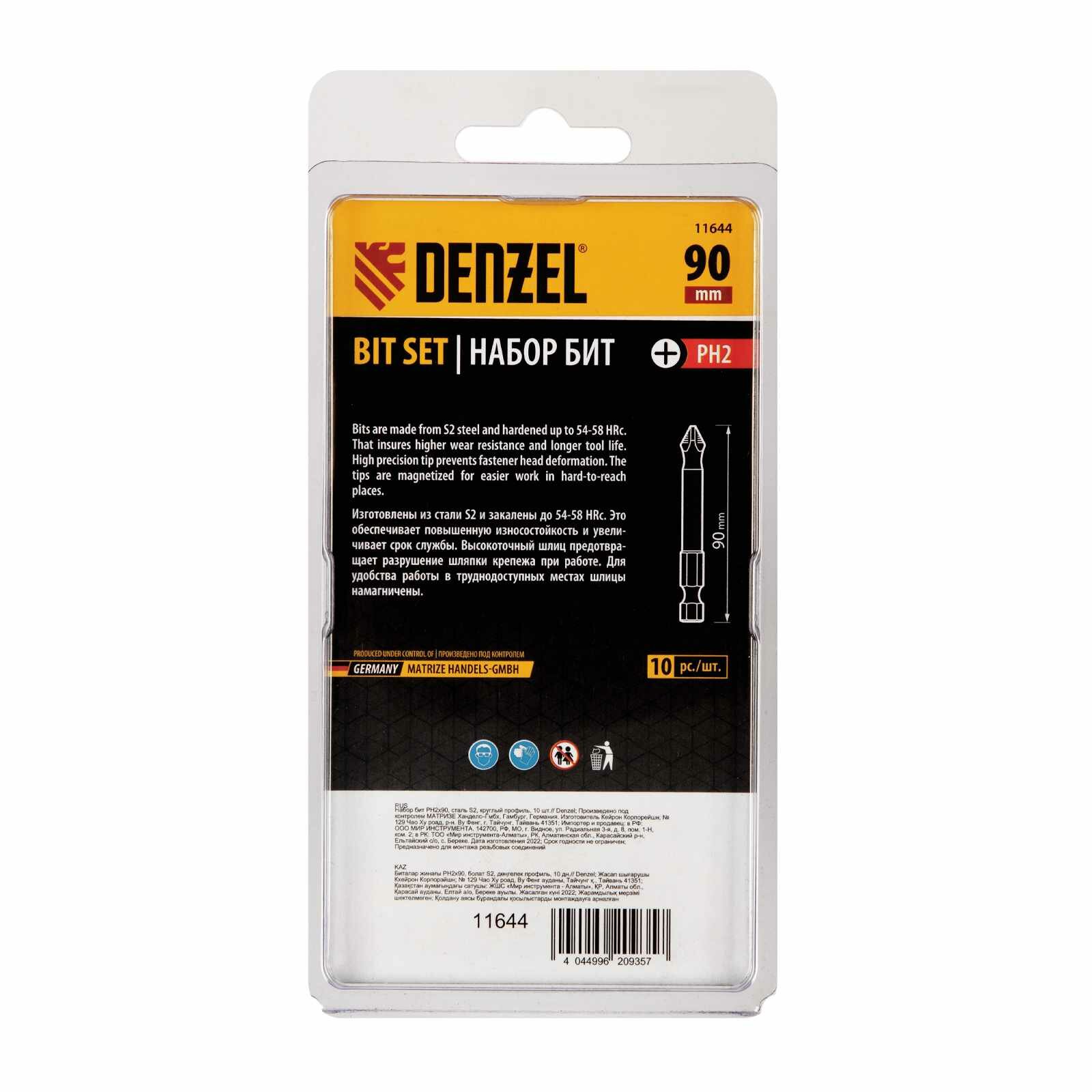 Набор бит PH2х90, сталь S2, круглый профиль, 10 шт.// Denzel 11644