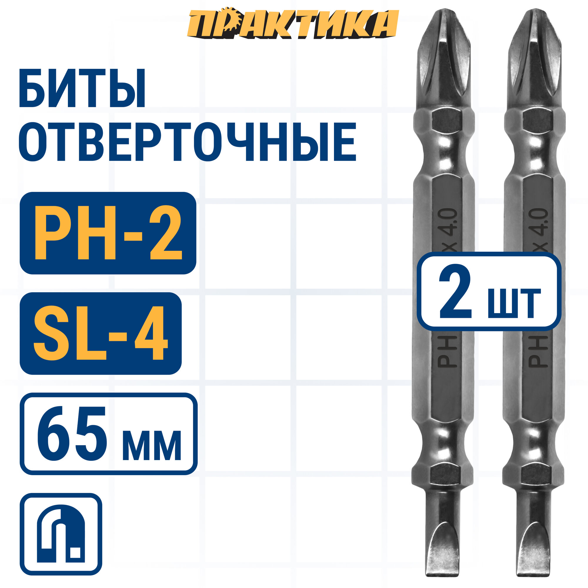 Бита отверточная ПРАКТИКА "Профи" двусторонняя PH-2 / SL 0.5x4 х 65мм (2шт), блистер (776-546) интересное: