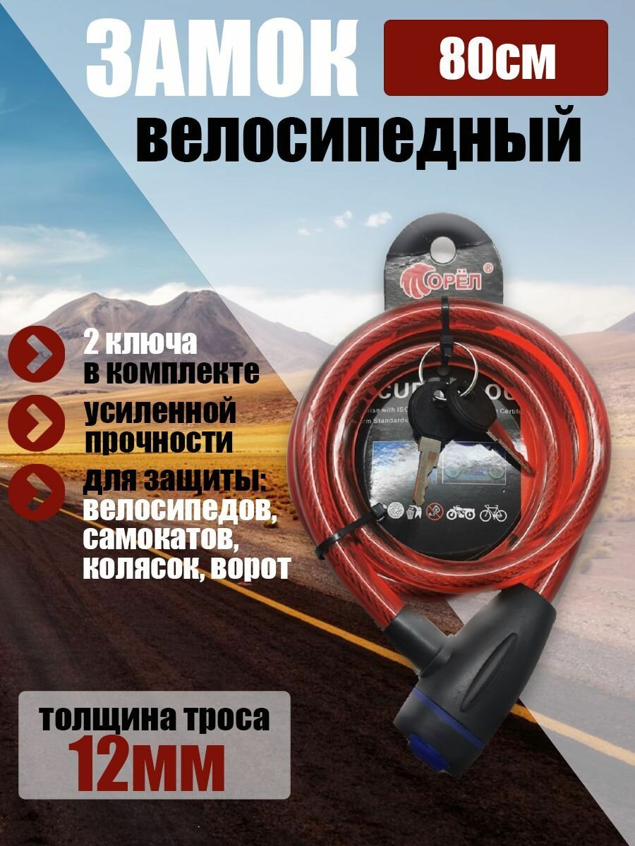 Замок велосипедный, всепогодный трос 80см красный, 12мм. интересное: