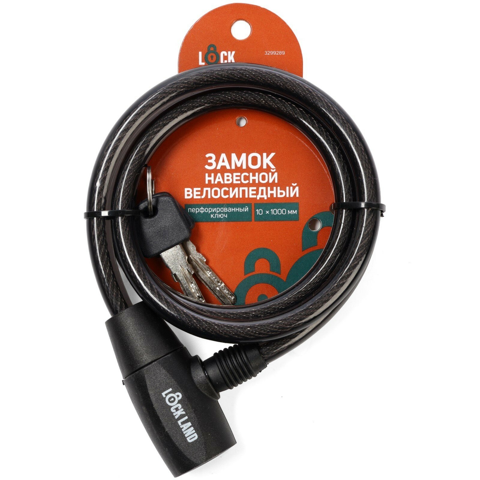 Замок навесной велосипедный LOCKLAND, 10 х 1000 мм, перфорированный ключ с пластиковой ручкой 329928