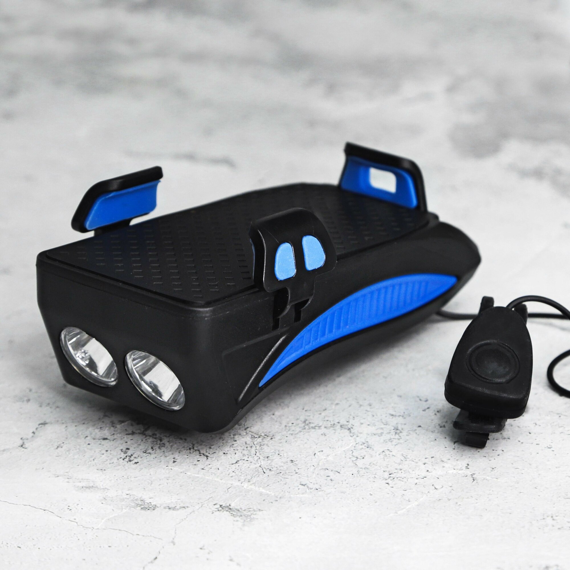 Велосипедный фонарь-фара с возможностью Power Bank и встроенным клаксоном / LED фонарь - держатель для телефона с зарядкой USB / Синий интересное: