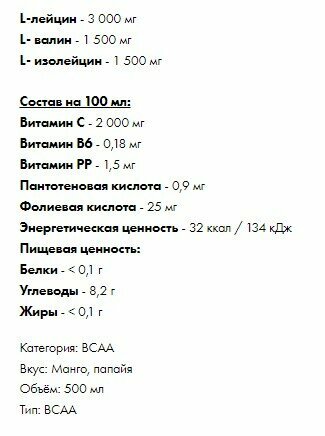 | Отзыв: | Напиток ВСАА 6000 апельсиновый хоть и имеет несколько искусственный вкус, но не приторный и не противный (ананас мне меньше понравился). Не газированный. Жажду утоляет хорошо. И главное, что реально помогает восстановится после интенсивной тренировки, чего не ожидал, покупая первую бутылку просто потому, что ничего другого в тот момент не было. Теперь заказал себе сразу блок из 12 штук.