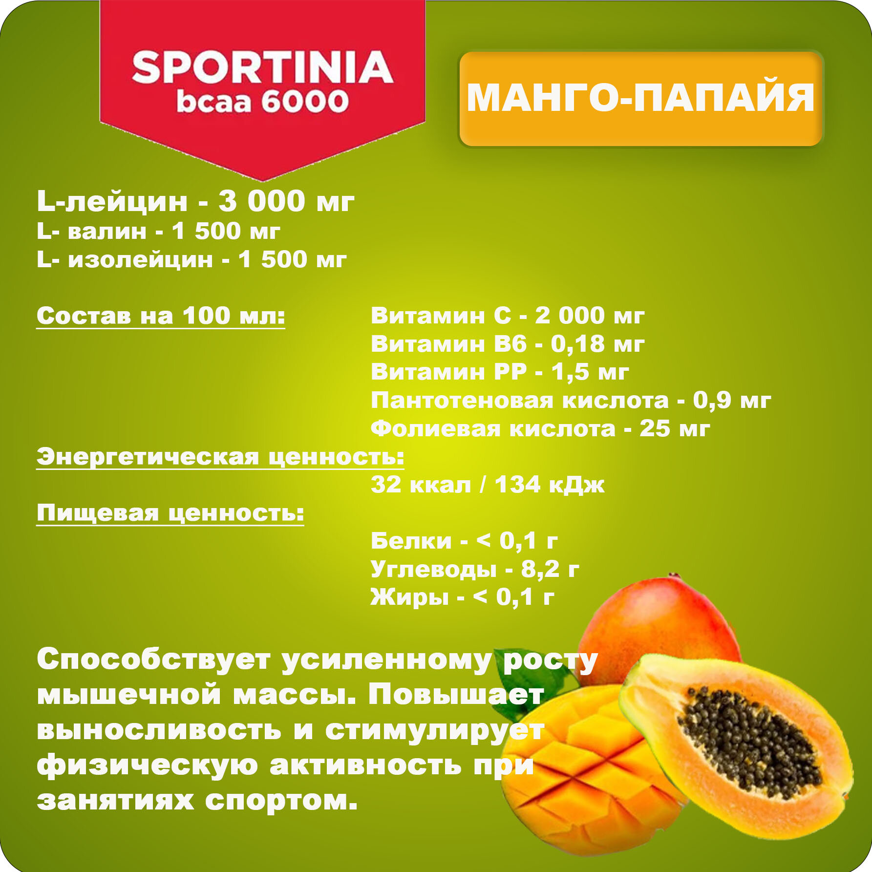 Купить Спортивный напиток Sportinia ВСАА (Спортиния БЦАА) 6000 Манго-Папайя 0.5 л / 12 бут.