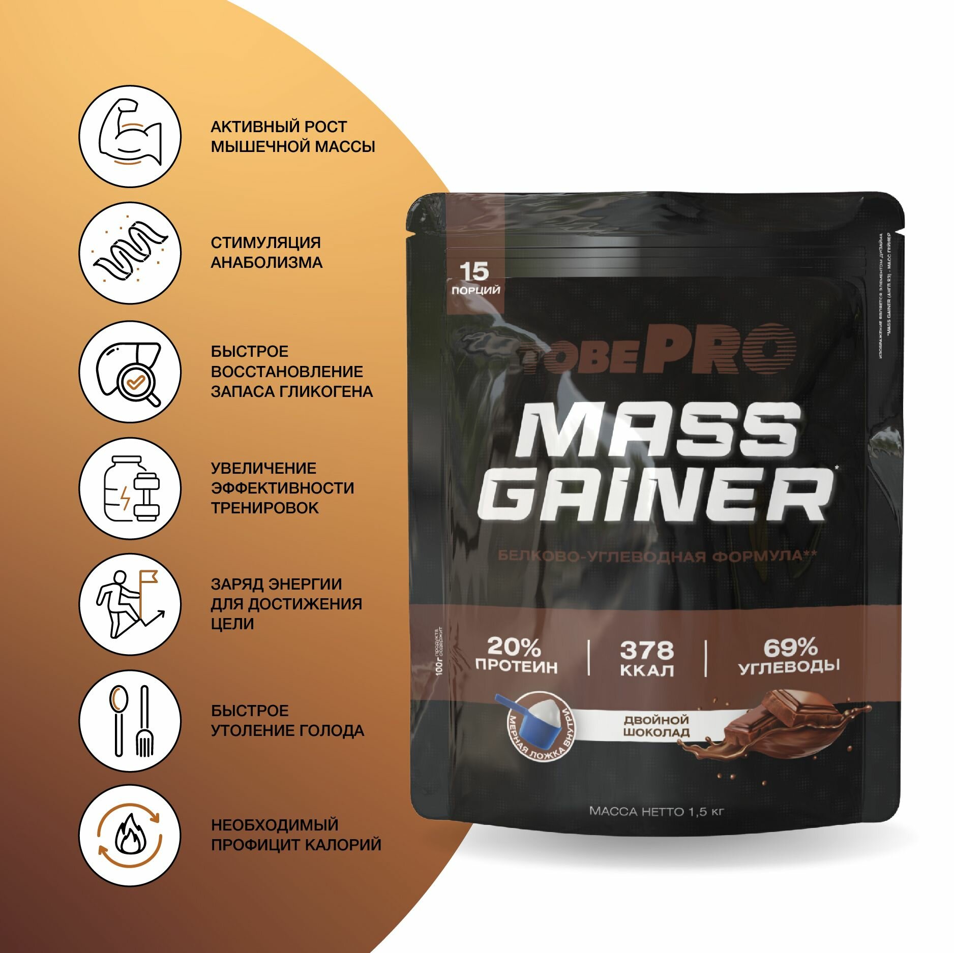 Гейнер TobePRO MASS GAINER для набора массы Двойной шоколад, 1,5 кг/15 порций