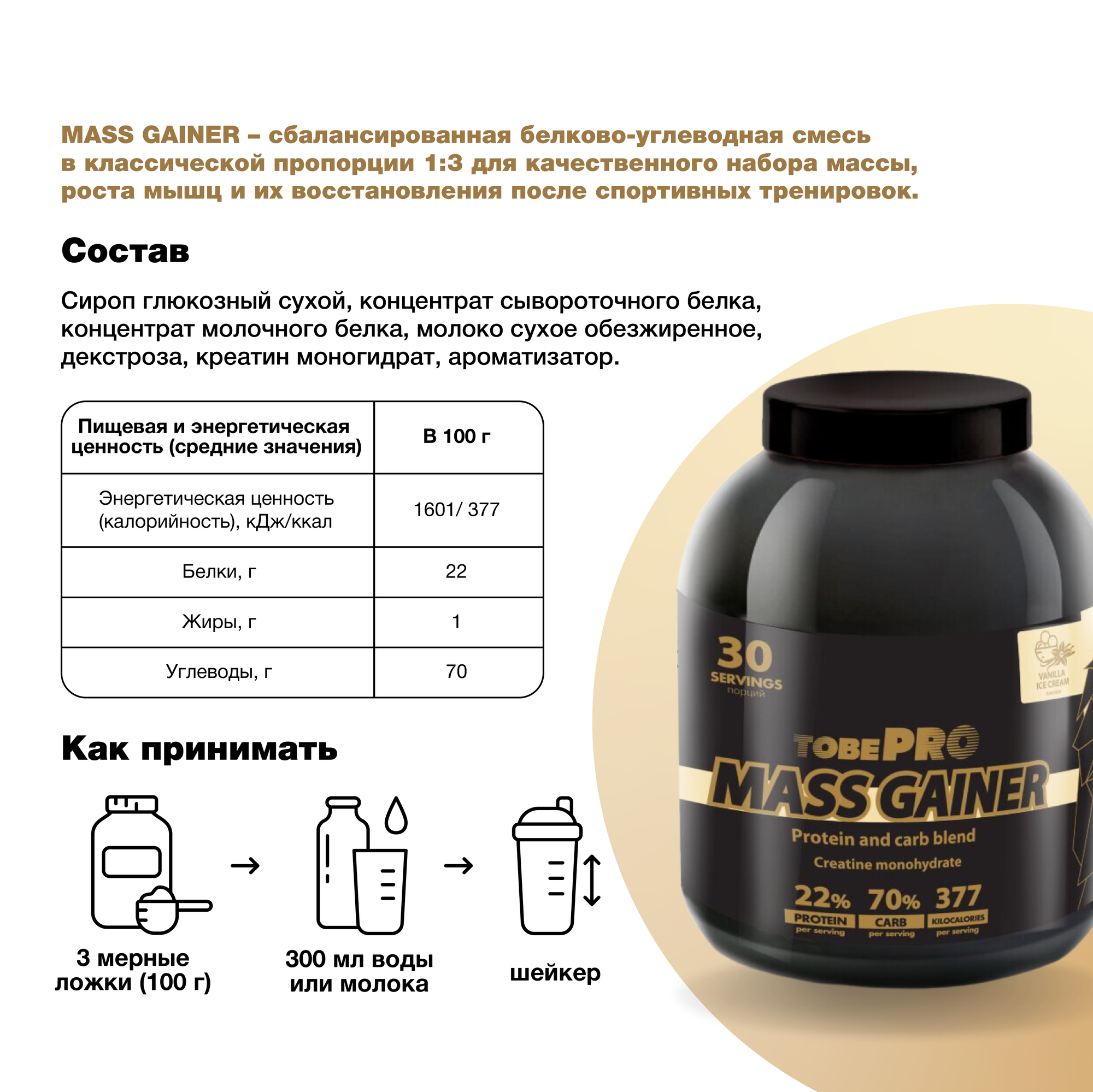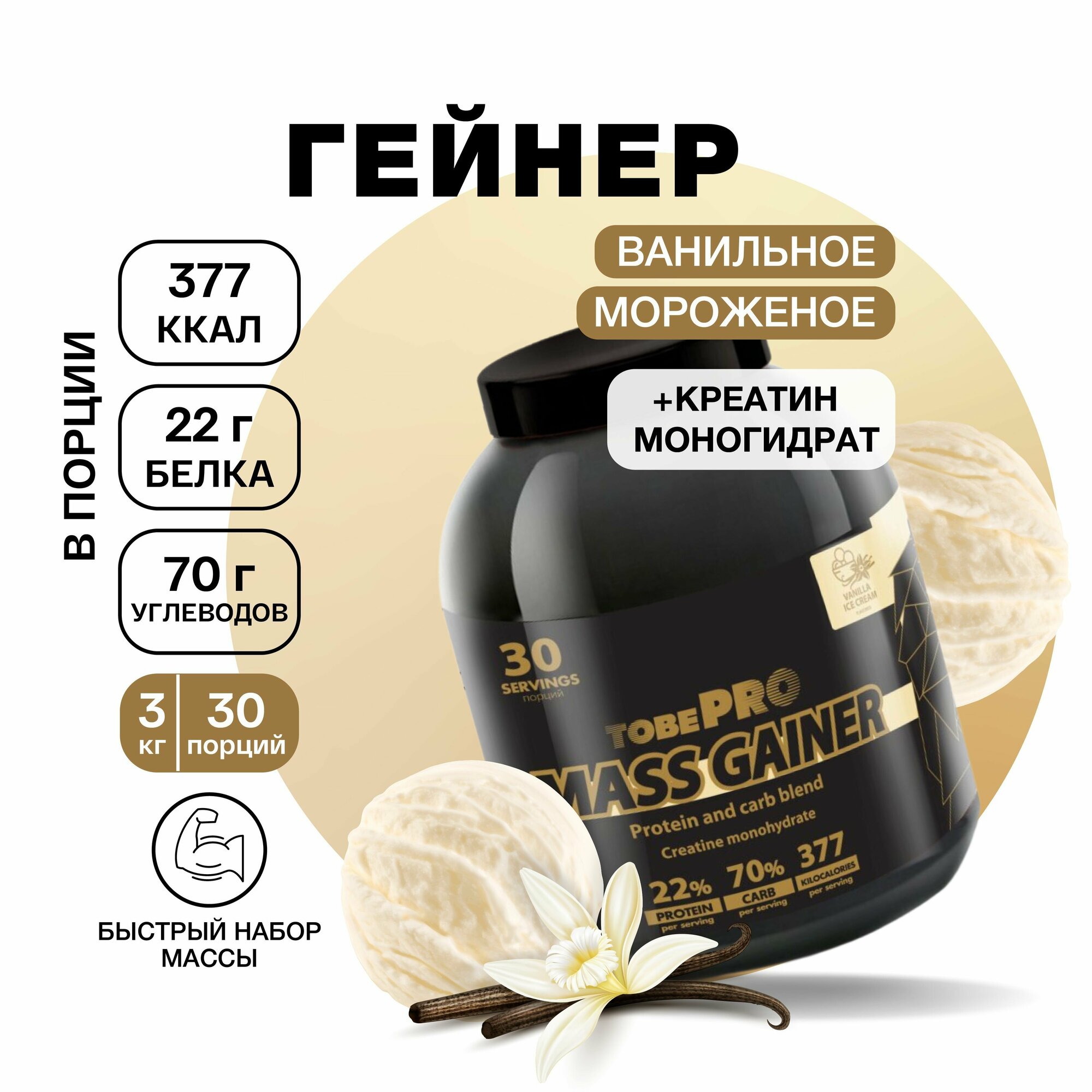 Гейнер TobePRO MASS GAINER для набора массы Ванильное мороженое, 3кг/30 порций