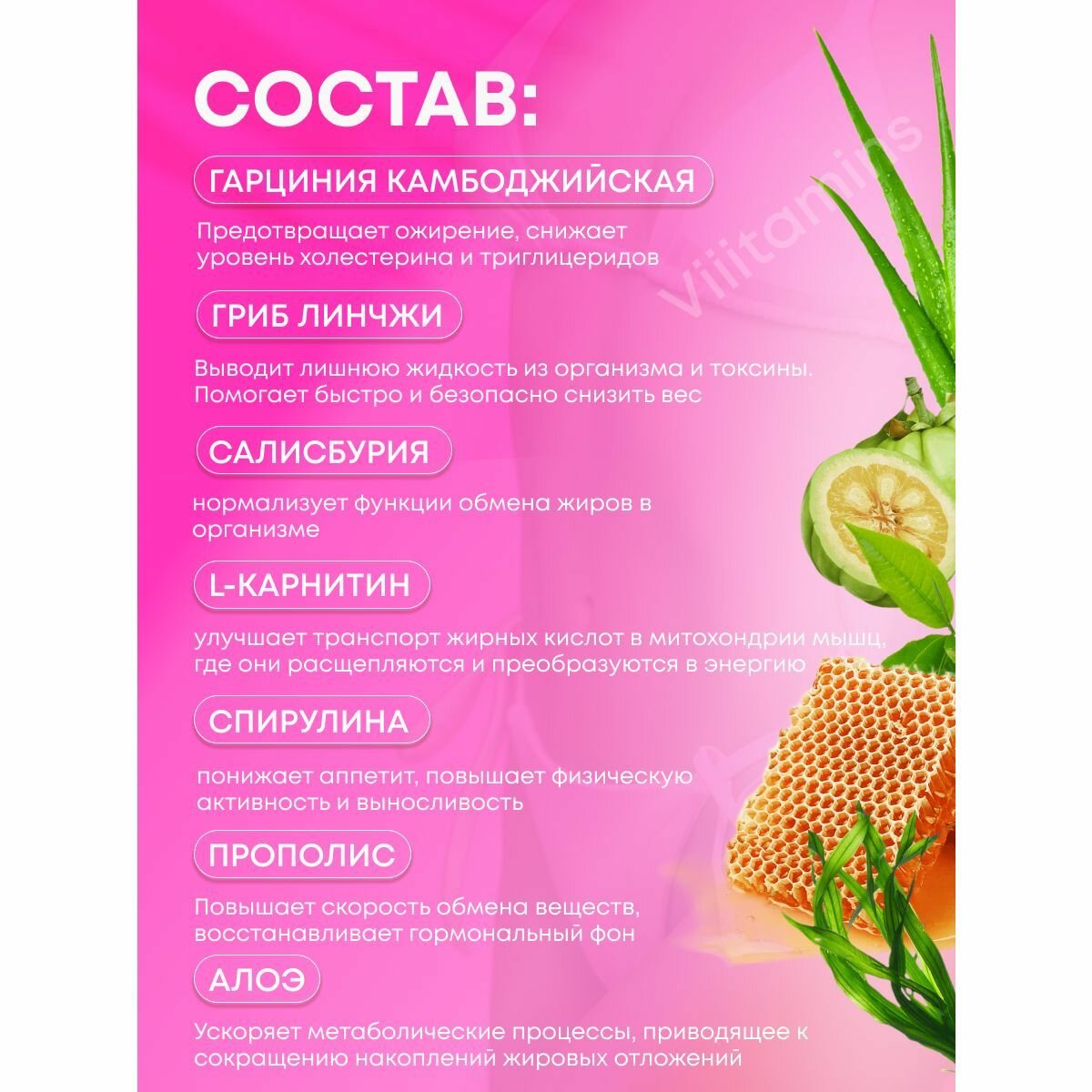 | Дополнительная информация | Помогает организму избавиться от лишнего веса до 20 кг, отбивает интерес к сладкому, препятствует набору весу |