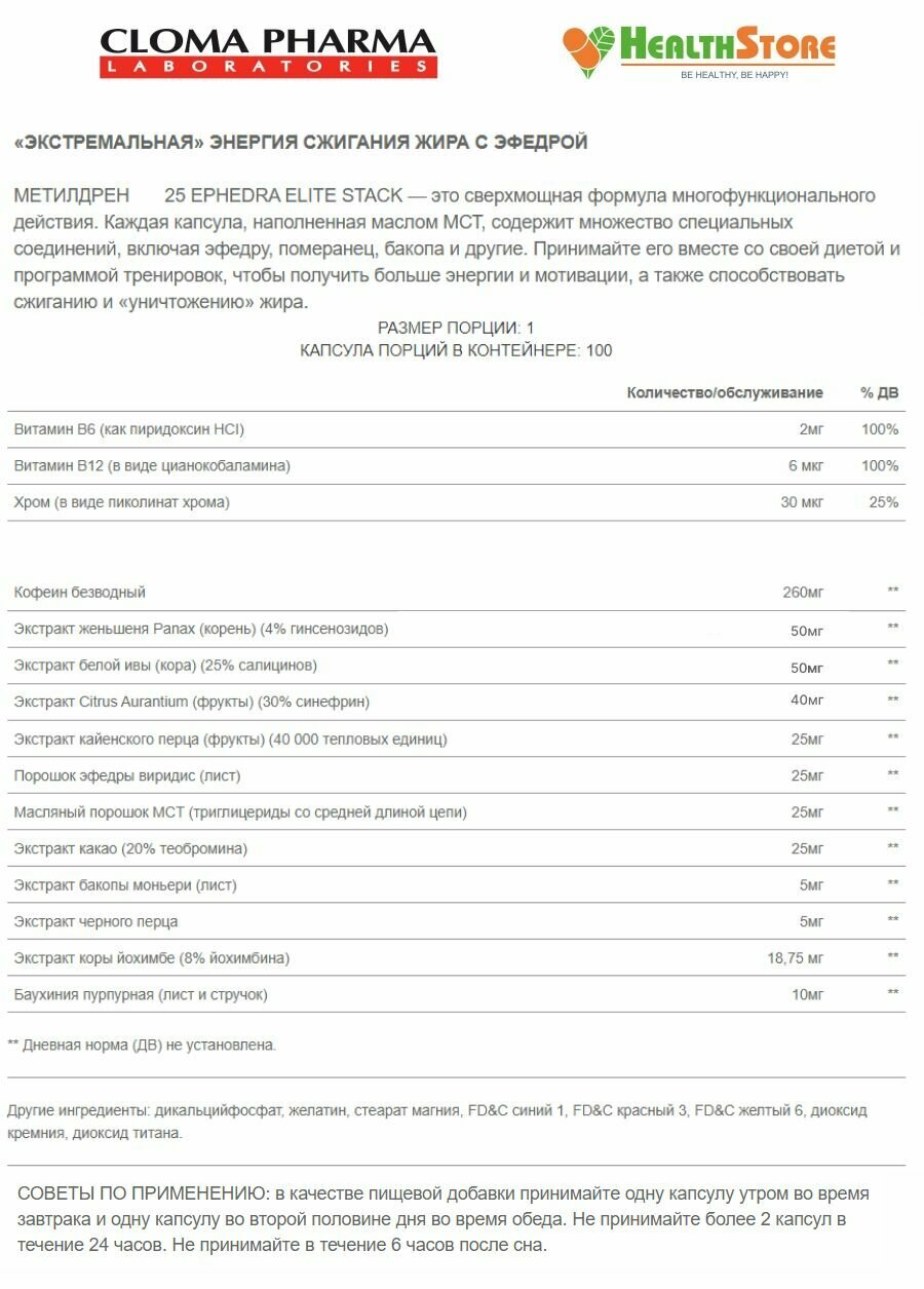 Ниже Вы можете прочитать отзывы на Жиросжигатель Cloma Pharma Laboratories Methyldrene Original 25 Elite Stack 100 капсул, капсулы для похудения, ознакомится с подробными характеристиками, посмотреть интересные обзоры и фотографии на Жиросжигатель Cloma Pharma Laboratories Methyldrene Original 25 Elite Stack 100 капсул, капсулы для похудения.