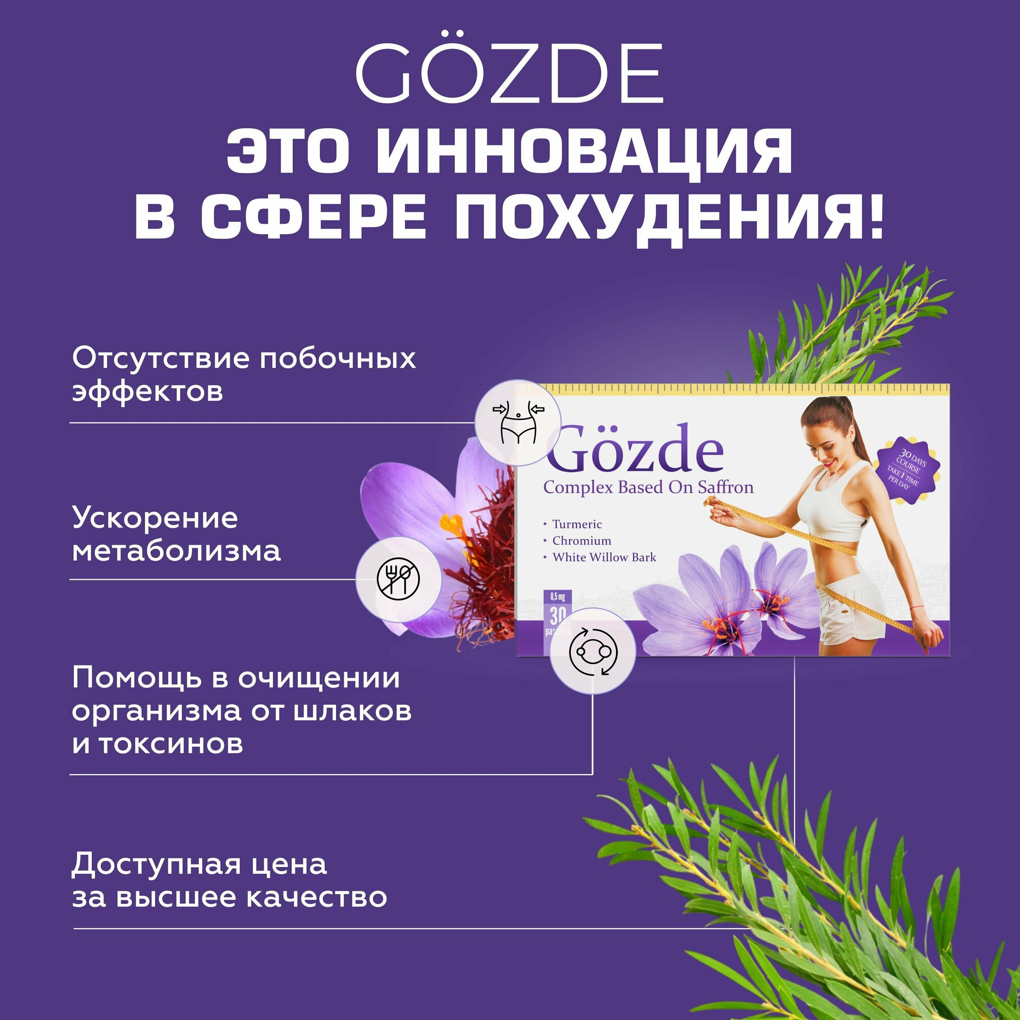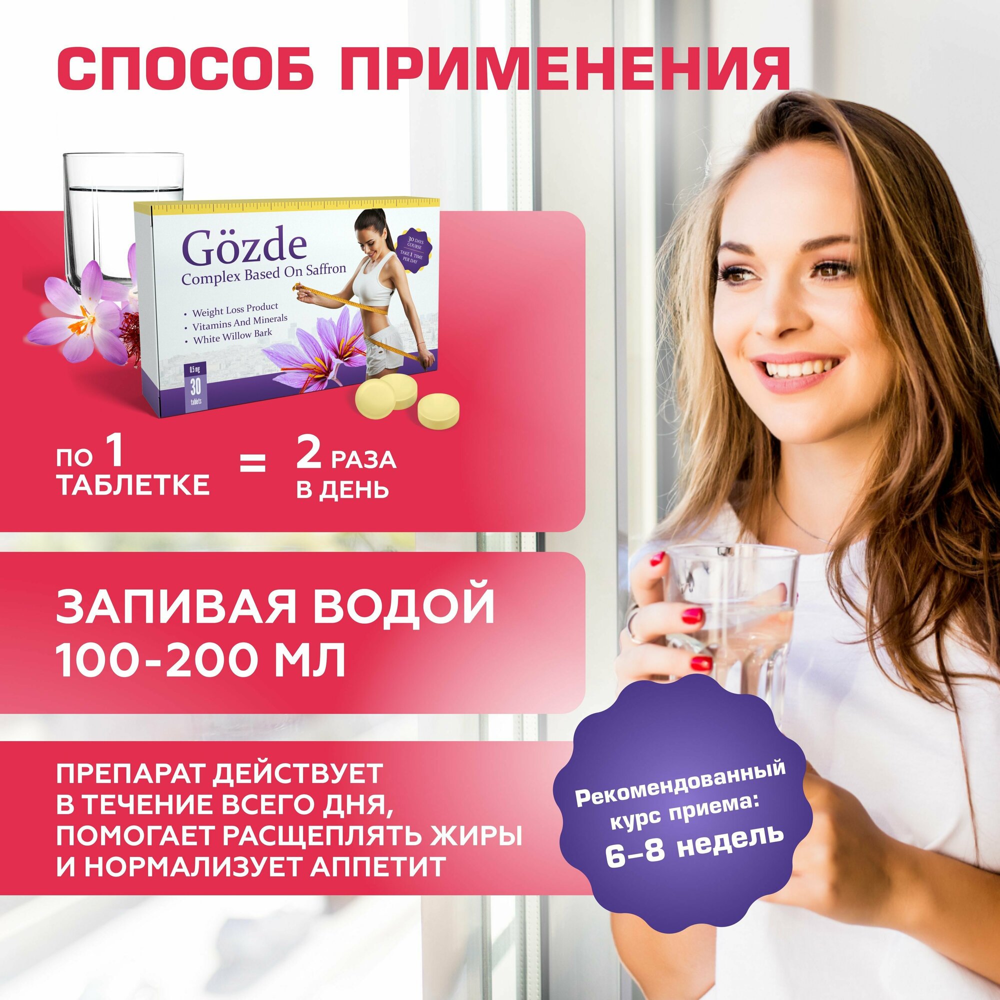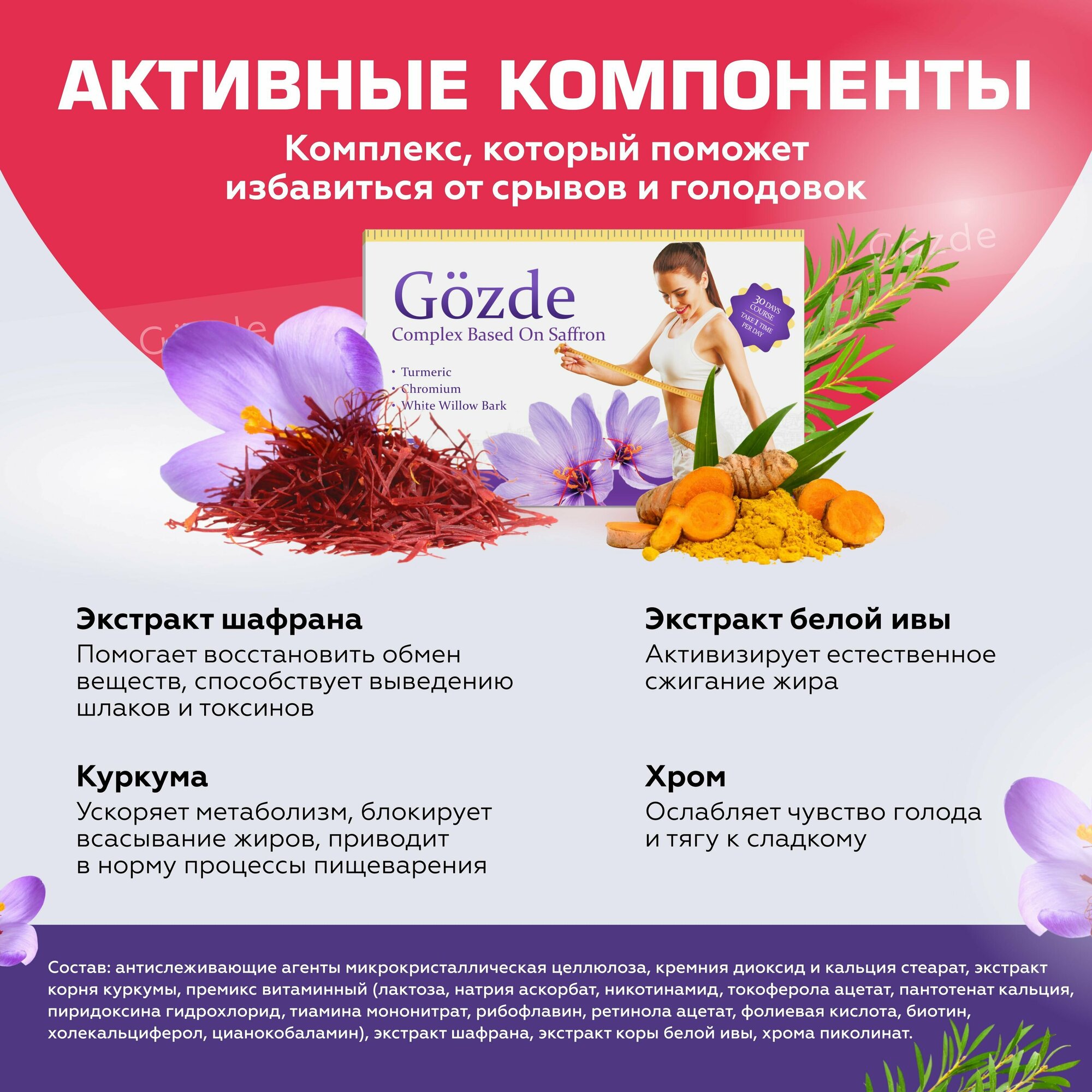 | Дополнительная информация | НАЗНАЧЕНИЕ: контроль веса, ускорение метаболизма (обмена веществ), насыщение организма полезными элементами, коррекция фигуры, красота и здоровье, детокс, очищение организма, похудение/сушка; СОСТАВ: микрокристаллическая целлюлоза, диоксид кремния, стеарат кальция, экстракт корня куркумы, витаминный премикс, экстракт шафрана, экстракт коры белой ивы, пиколинат хрома. |