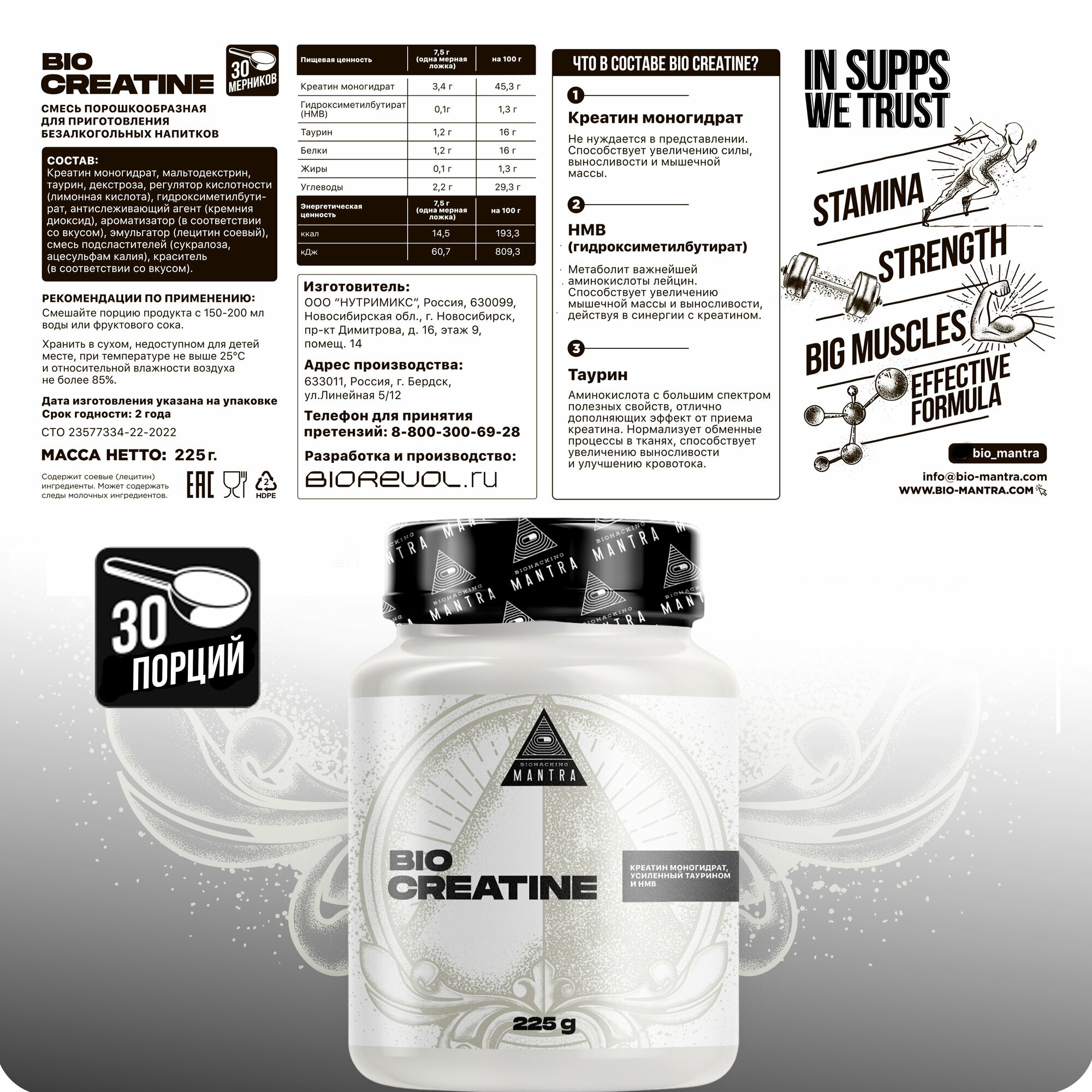 Биокреатин, креатин с hmb и таурином, экзотик, 225 г