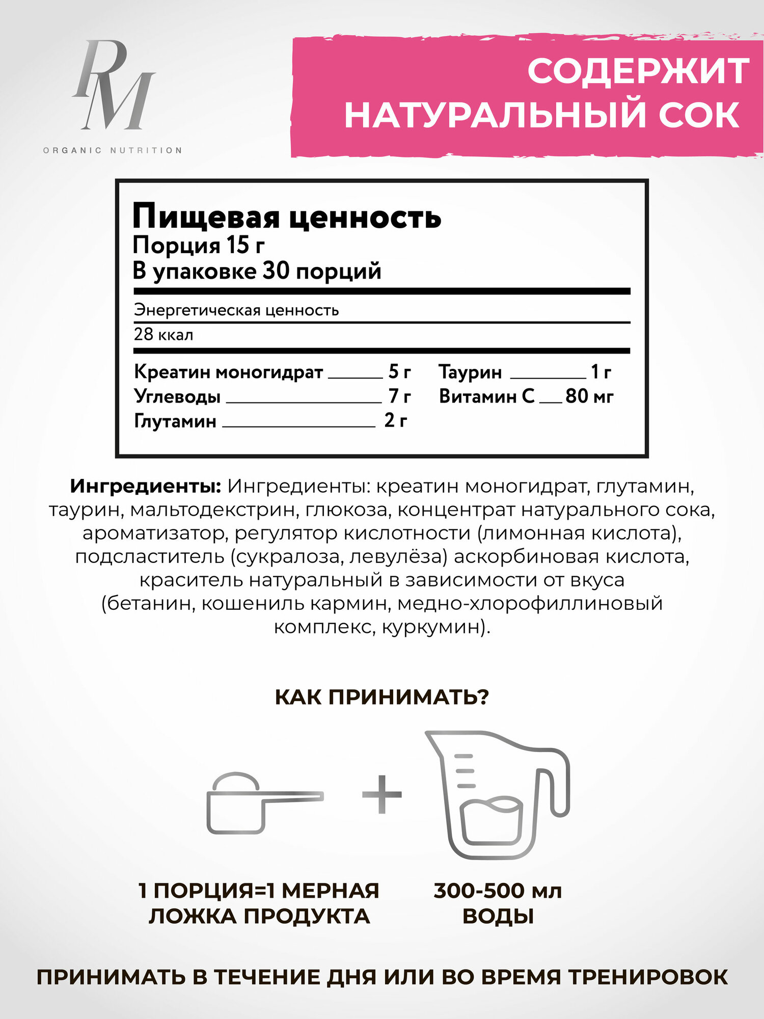 Креатин с таурином и глутамином, PM-Organic Nutrition, Черная смородина, 450гр