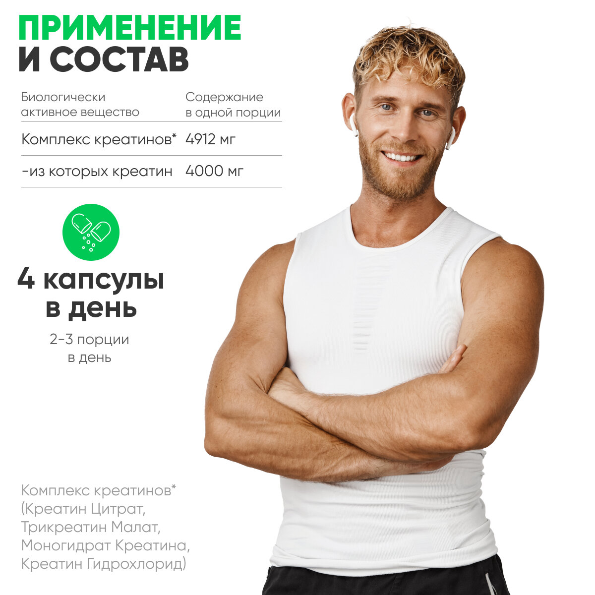 | Дополнительная информация | состав в 2 капсулах: Комплекс креатина (креатин цитрат, трикреатин малат, моногидрат креатина, креатин гидрохлорид) - 2456 мг (из них креатина - 2000 мг). Ингредиентный состав: креатин моногидрат, трикреатин малат, цитрат креатина, креатин гидрохлорид (84,7%), оболочка капсулы (желатин), краситель (диоксид титана), антислеживающий агент (магниевые соли жирных кислот) |