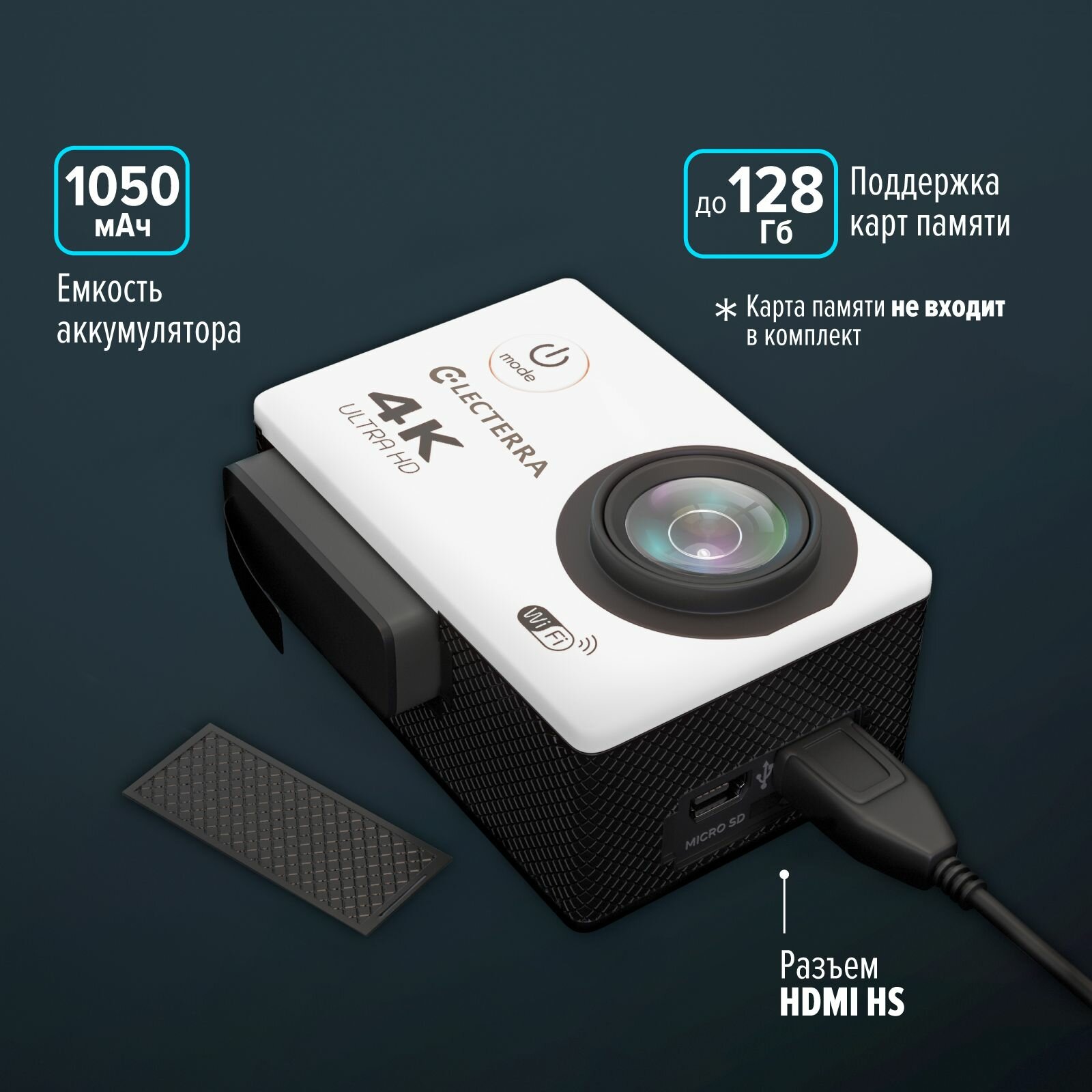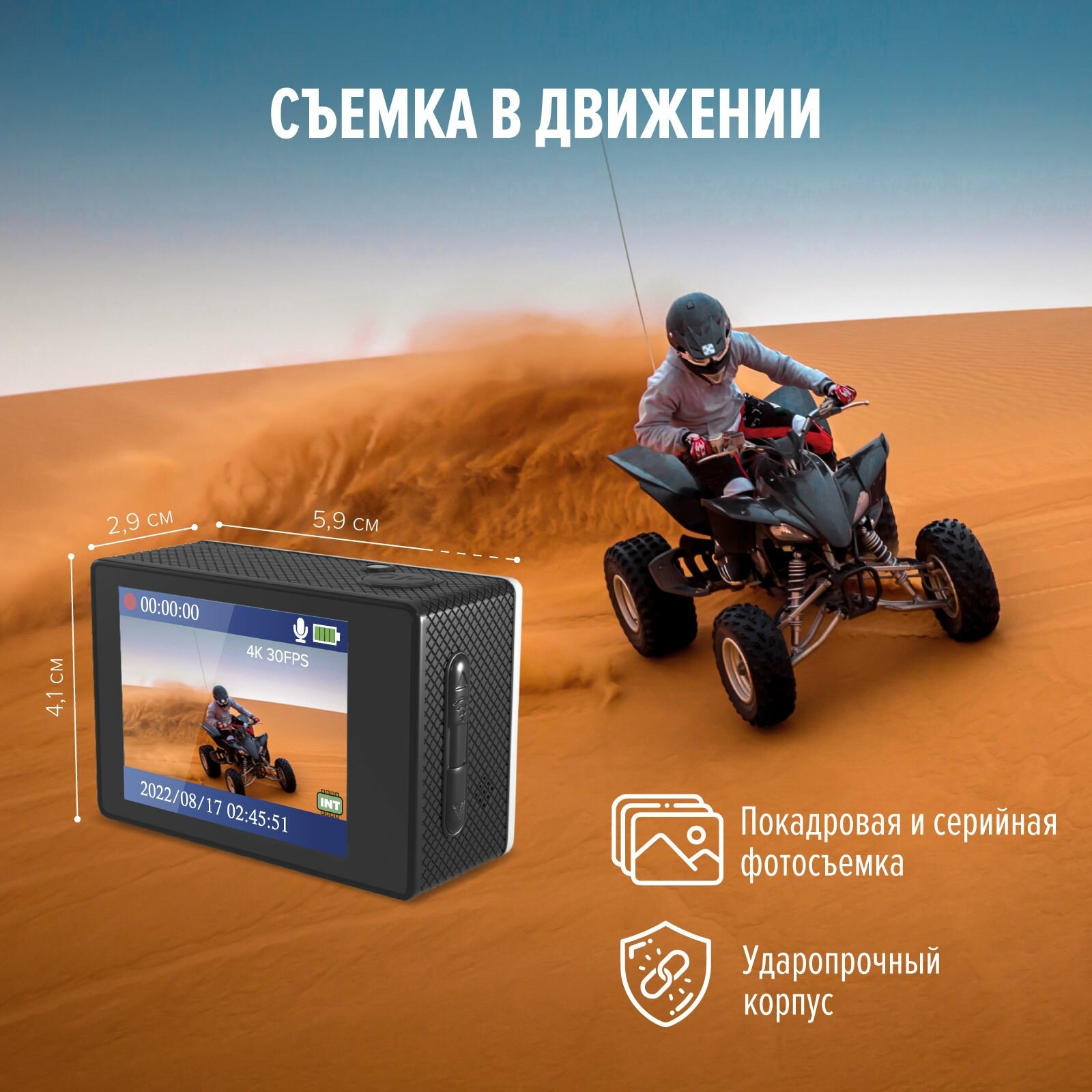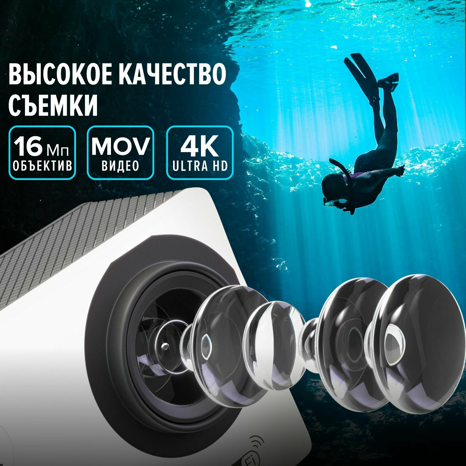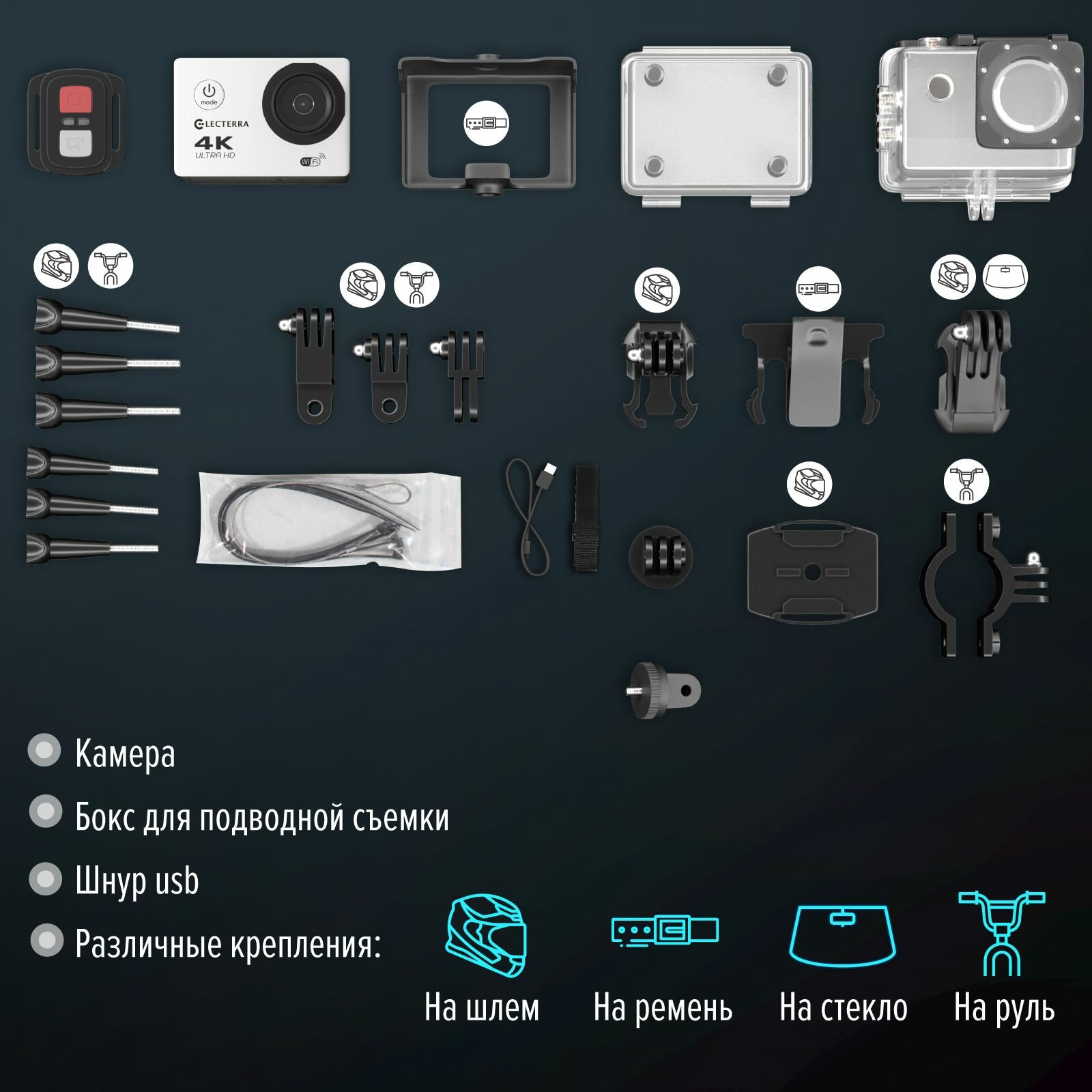 Купить Экшн-камера Electerra. Водонепроницаемая экшн камера 4K с креплениями и защитным кейсом для дайвинга. Экшен камера с интерполяцией