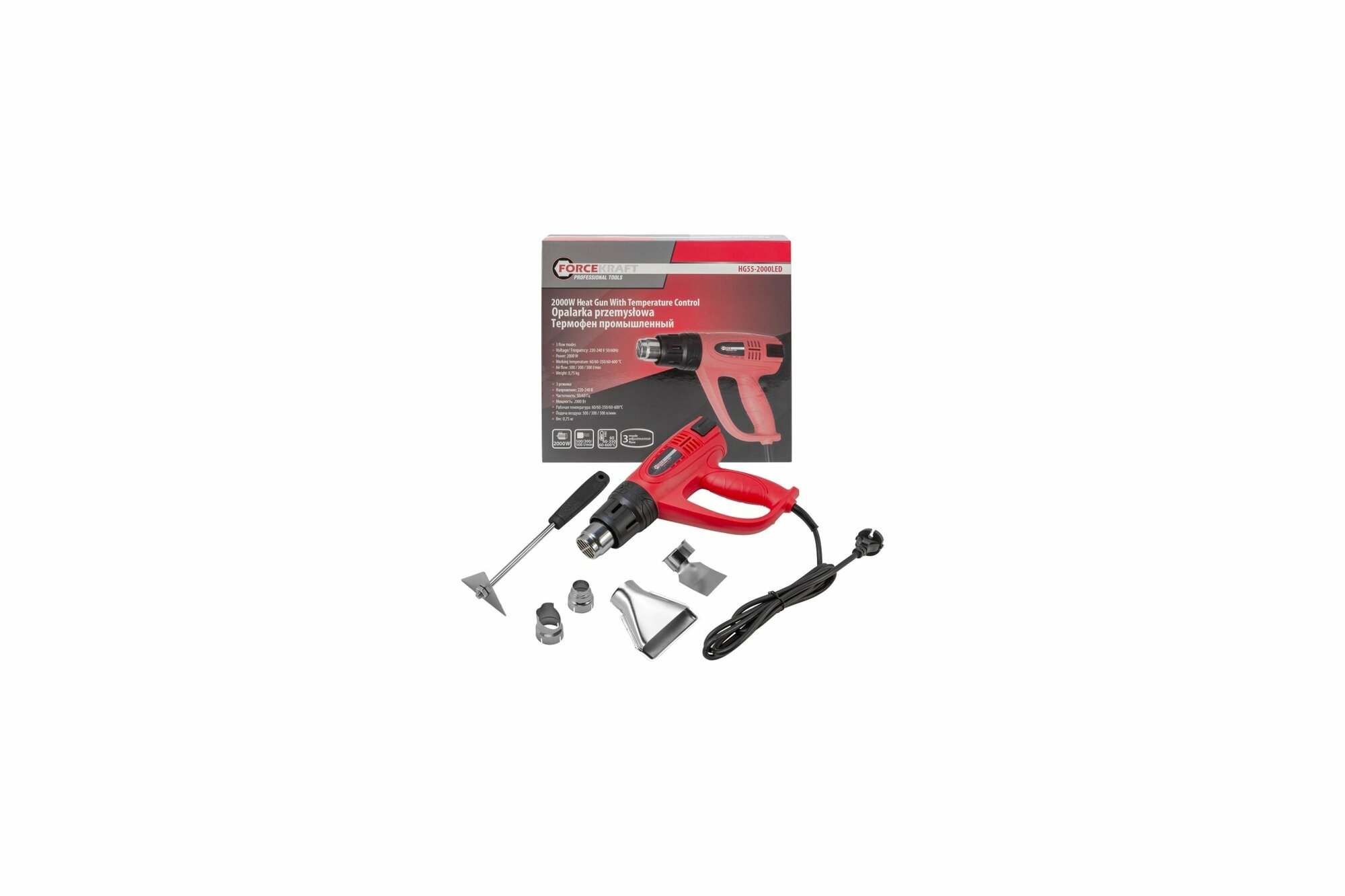 Фен промышленный электрический с насадками (220В,50/60Гц,2000Вт, 60/350/600C, 50/300/500л/мин,3 режима,класс защиты-двойная изоляция) FORCEKRAFT FK-HG55-2000LED