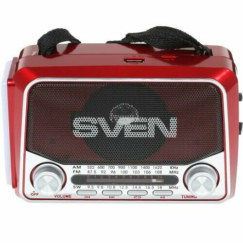 SVEN SRP-525 красный радиоприемник (3 Вт, FM/AM/SW, USB, SD/microSD, 2 x RCA, фонарь, 1200 мАч, 2 х D/UM)