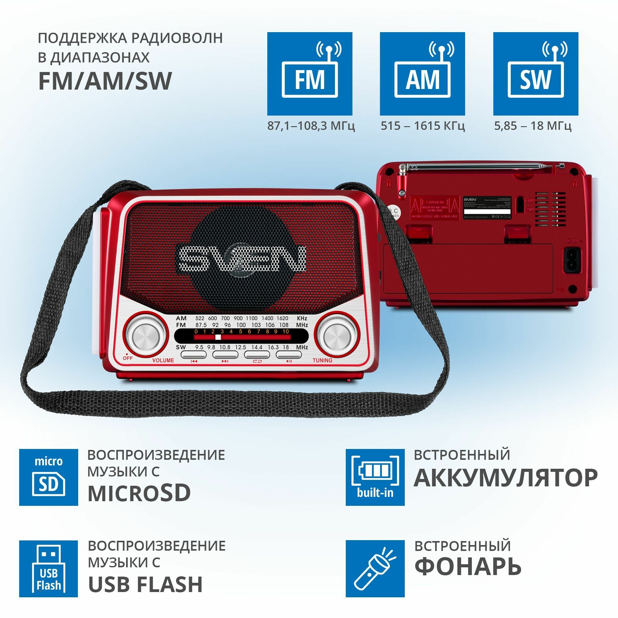 SVEN SRP-525, красный, радиоприемник, мощность 3 Вт (RMS), FM/AM/SW, USB, microSD, фонарь, встроенный аккумулятор