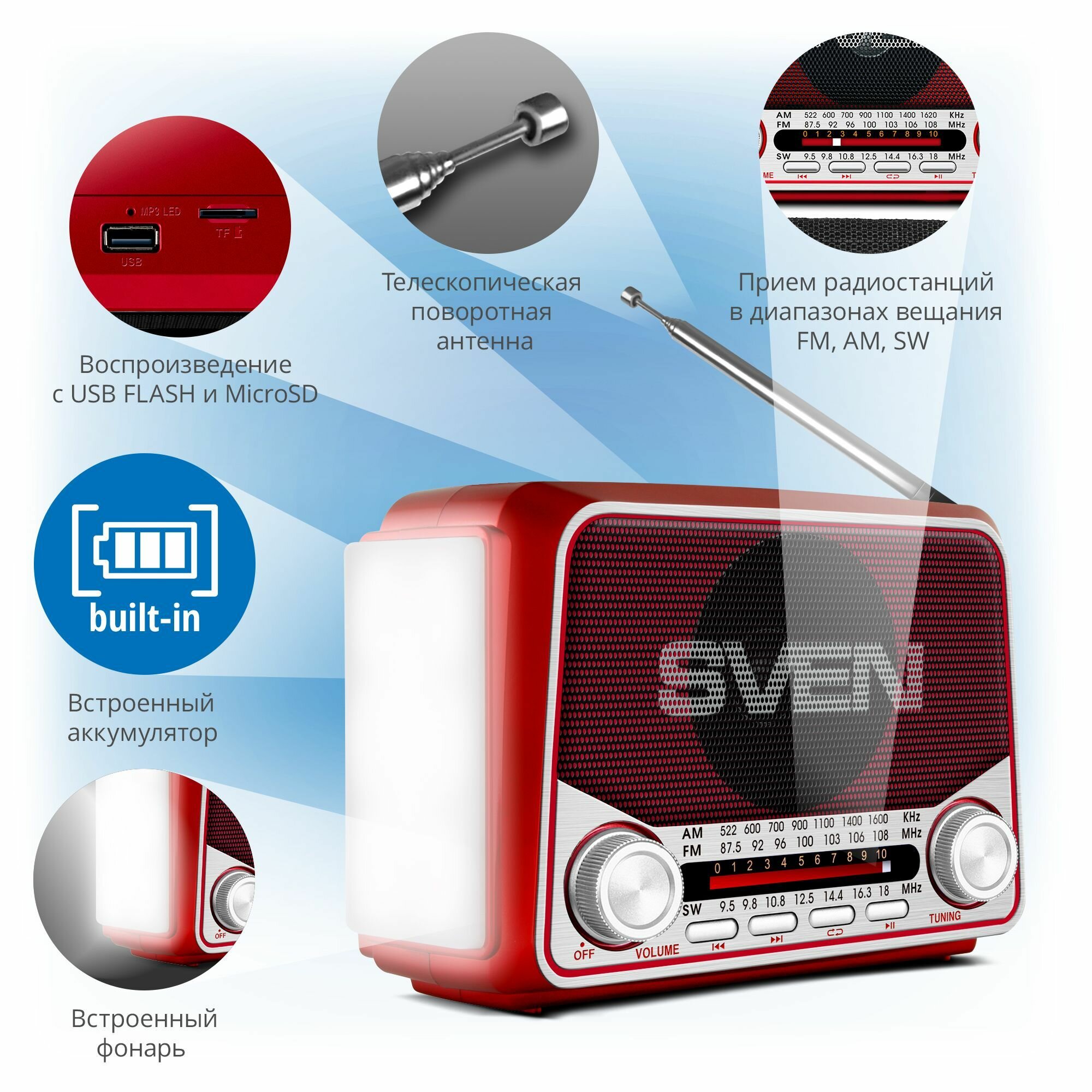 Радиоприемник SVEN SRP-525, красный/ 3 Вт/ FM/AM/SW/ USB/ microSD/ фонарь/ встроенный аккумулятор