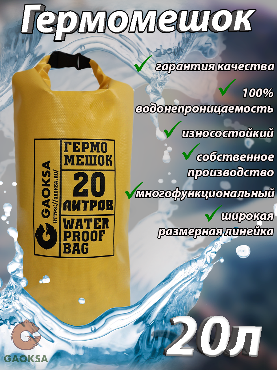 СохранитьВодонепроницаемый туристический гермомешок пвх GAOKSA, прочная гермосумка 20 л, желтый драйбег, охота и рыбалка интересное: