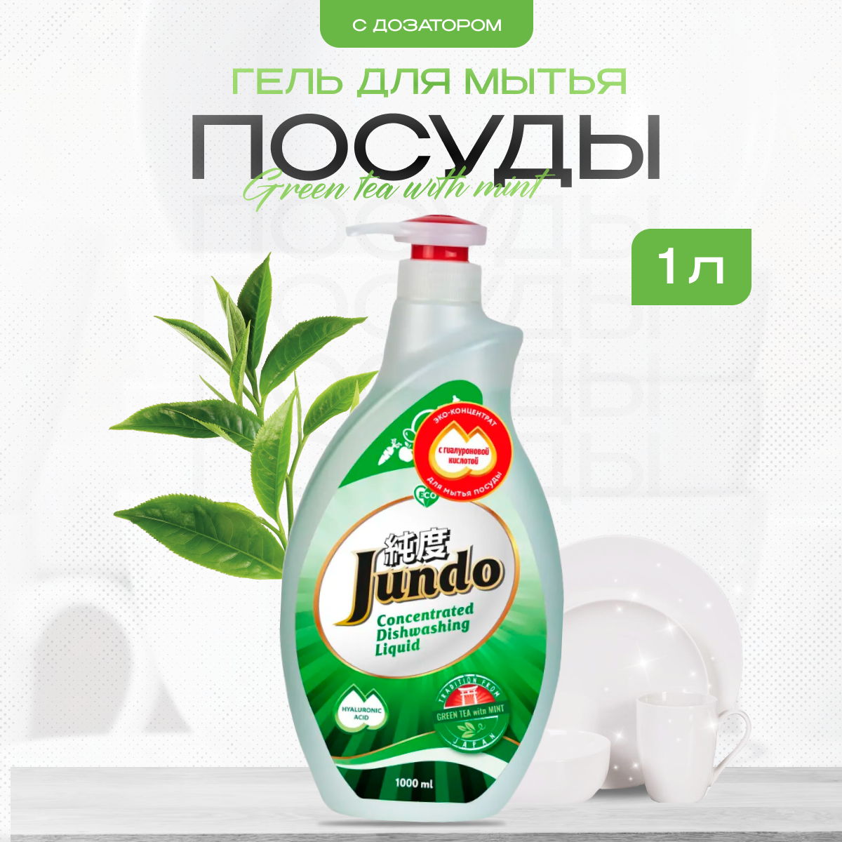 Купить Jundo Концентрированный ЭКО гель с гиалуроновой кислотой для мытья посуды и детских принадлежностей «Green tea with mint»,1л