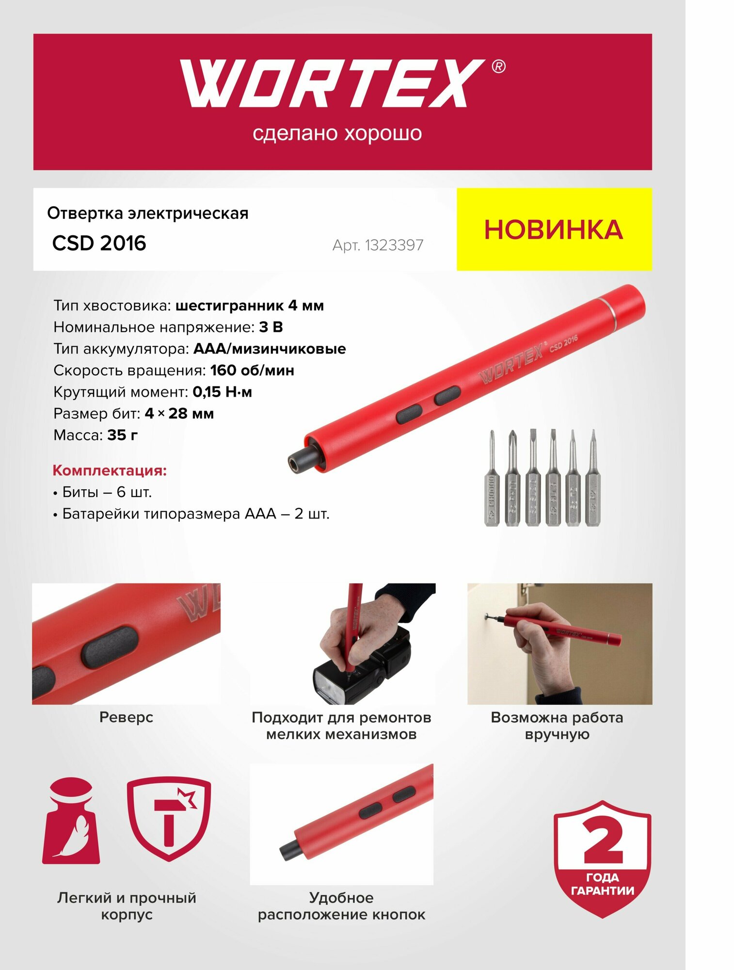 Отвертка электрическая Wortex CSD 2016 в блистере 0.15 Нм, 160 об/мин (Шестигранник 4 мм, 35 г) (1323397) (WORTEX) интересное: