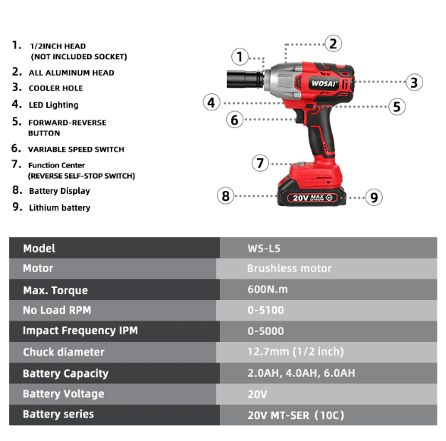 Гайковерт аккумуляторный с чехлом WOSAI WS-L5 600 Н*м, 20V, 4.0AH 2 аккумулятора интересное: