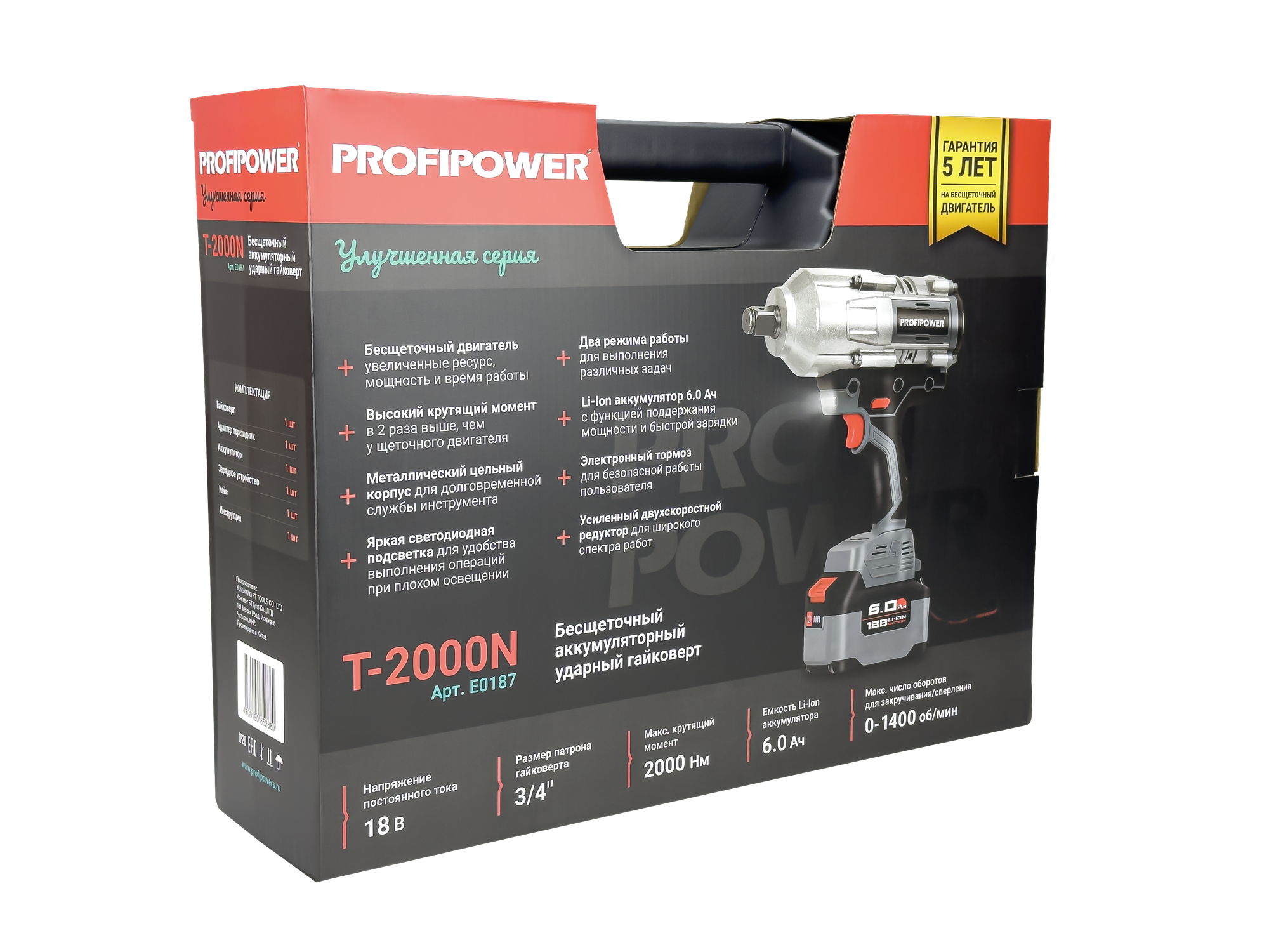 Гайковерт акк б/щ ударный ProfiPower T-2000N (Li-ion-1шт, 6.0Ач, 2000Нм,адаптер перех-ка,З/У,кейс)