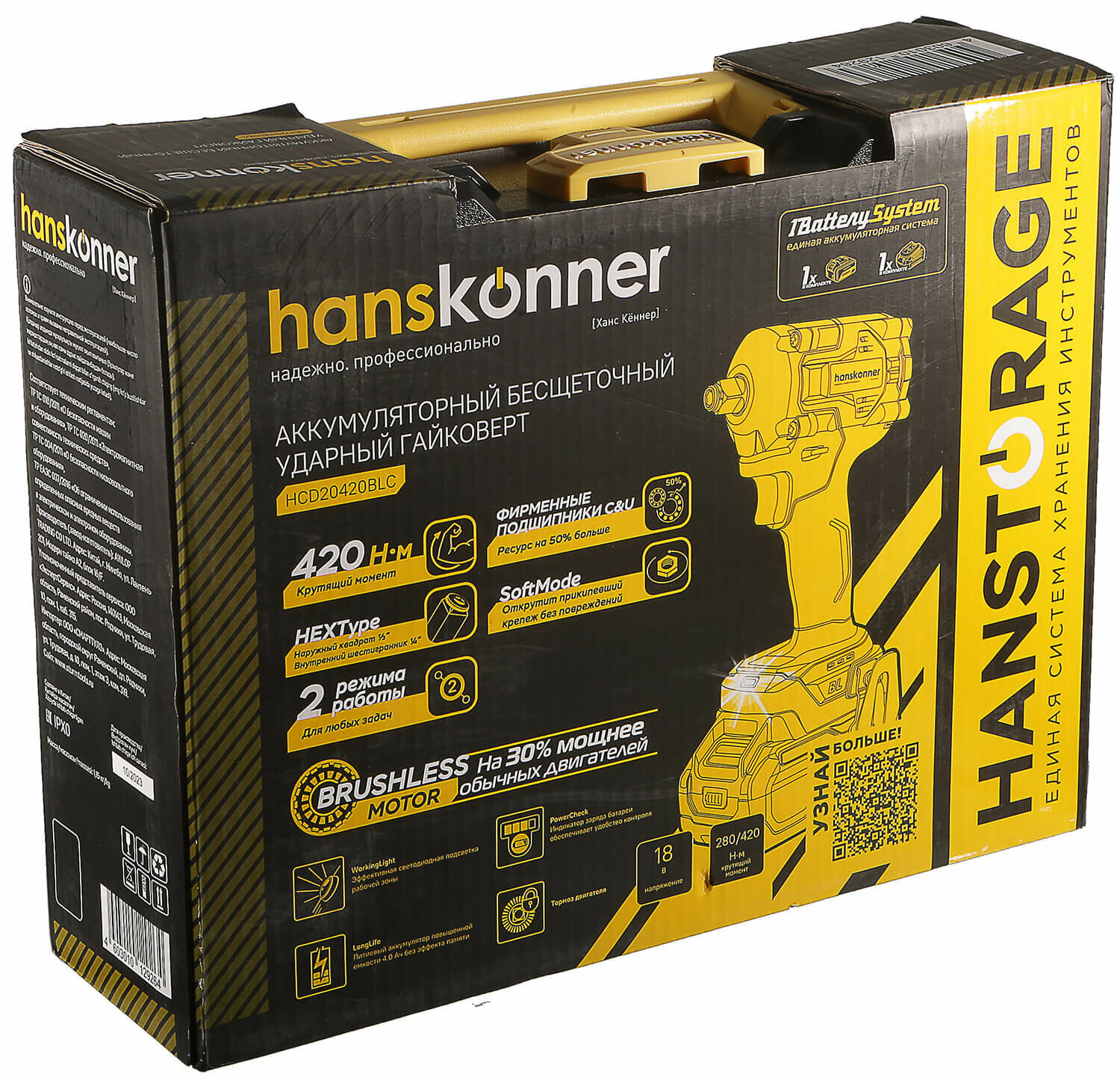 Купить Аккумуляторный ударный гайковерт Hanskonner HCD20420BLC 1BatterySystem (18 В, 420Нм, 1/2, 2 скор, 1x4.0Ач, кейс HS)