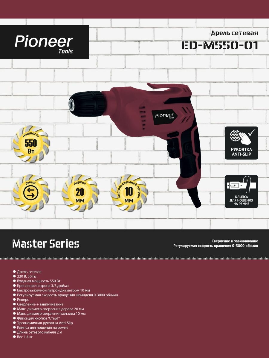 Купить Электродрель Pioneer ED-M550-01 с реверсом, регулируемая скорость до 3000 оборотов в минуту, быстрозажимной патрон, рукоятка Anti-Slip, 550 Вт
