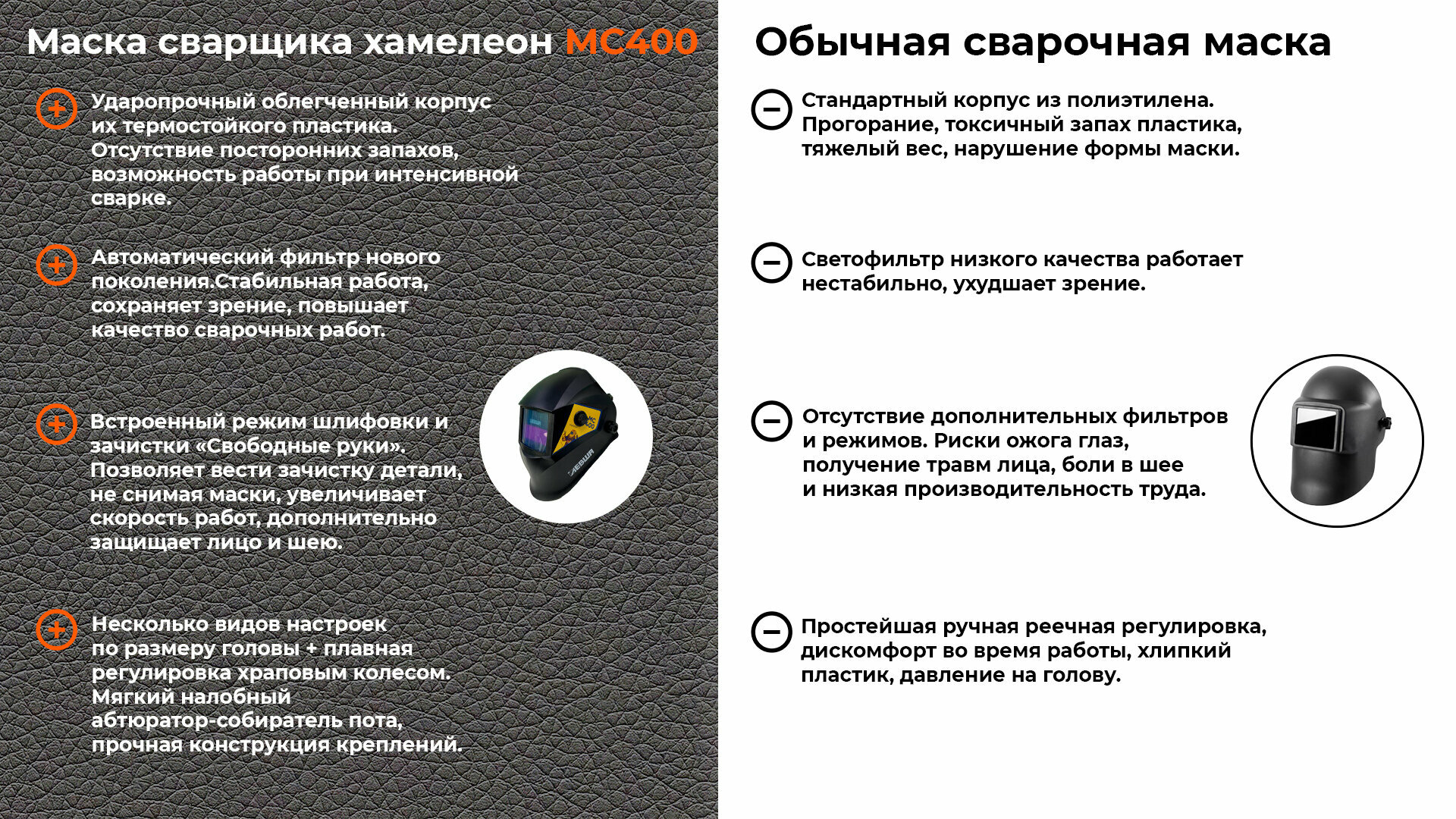 СохранитьМаска сварочная МС 400 Хамелеон, окно 90*35мм, DIN 4/9-13 (внешняя плавная регулировка) защита от УФ/ИК: DIN 16, в индивидуальном коробе, левша интересное: