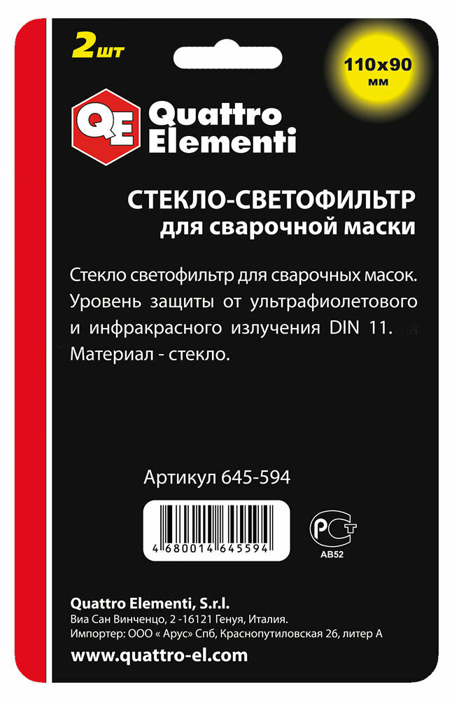 | Дополнительная информация | Стекло для сварочной маски QUATTRO ELEMENTI 110х90мм светофильтр DIN 11 |