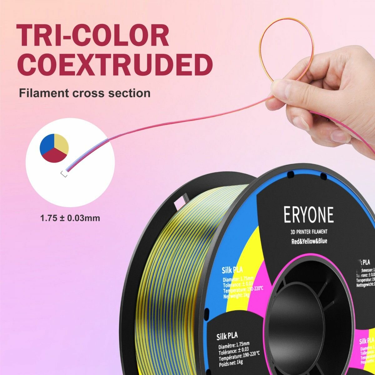 Купить PLA Silk Tri-Color 1,75 мм 1 кг (Eryone) Красный - Желтый - Синий