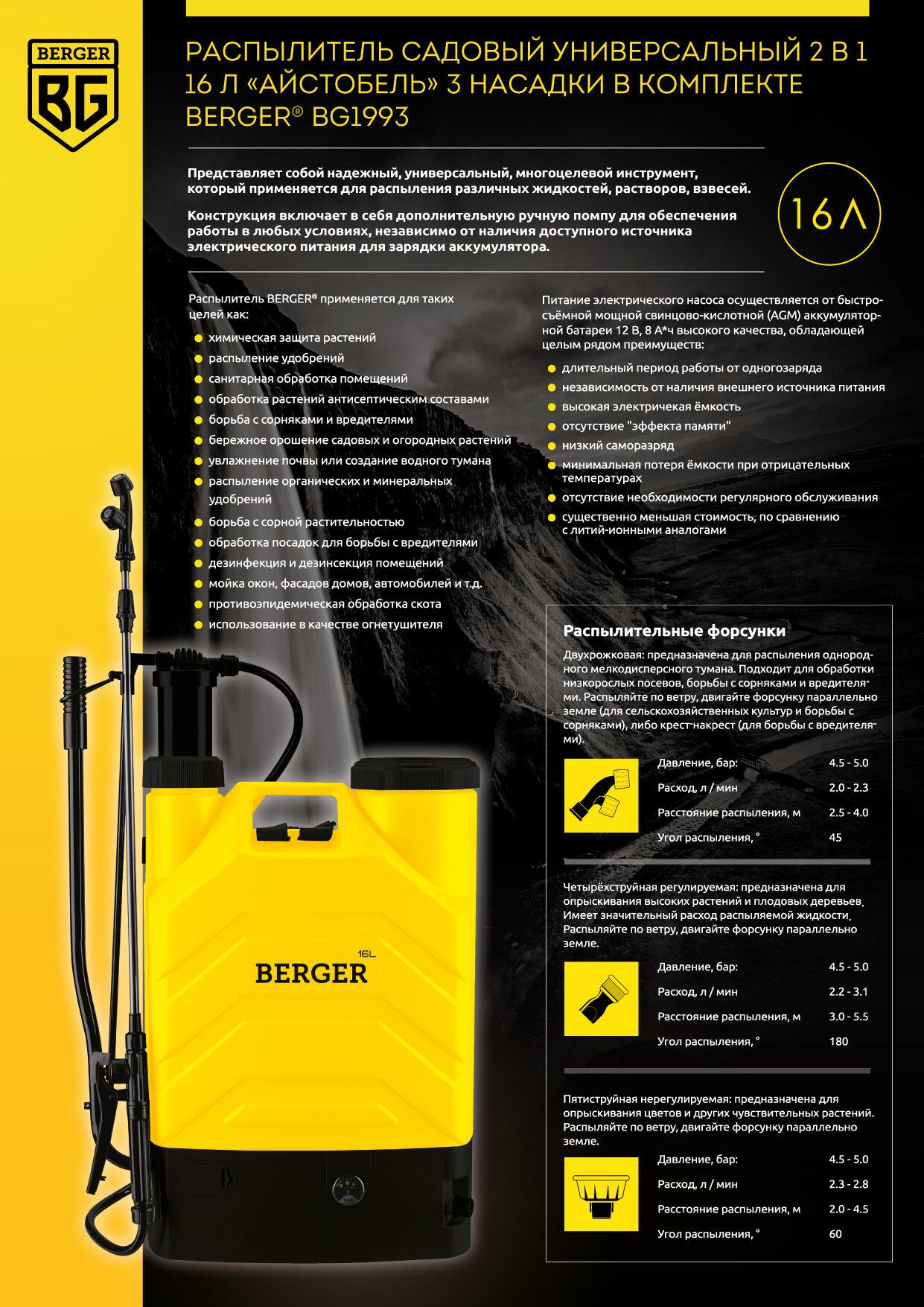 Berger BG Распылитель садовый аккумуляторный/ручной 2в1 16л (3 насадки в комплекте) BERGER BG1993