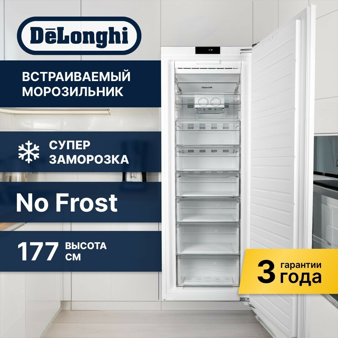 Встраиваемая морозильная камера DeLonghi DFI 17NFE PAOLO, белая, объем 221 л, 7 выдвижных ящиков, Сенсорное управление, Door on Door,