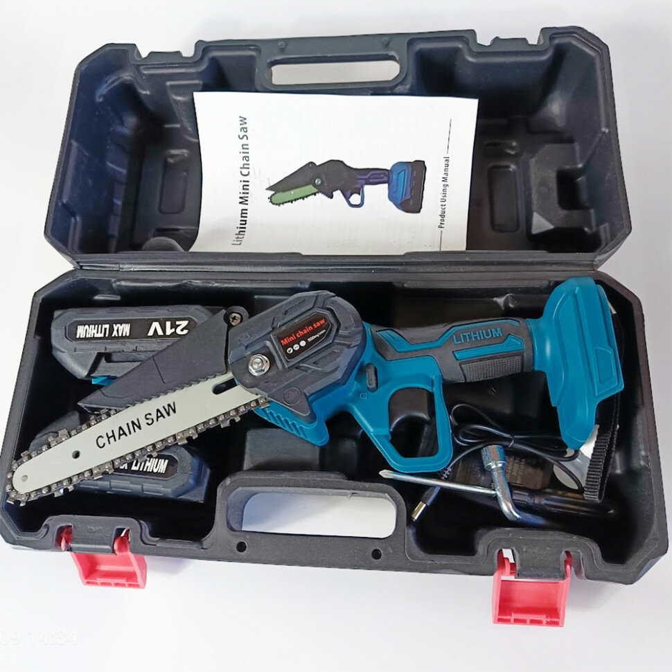 Аккумуляторная цепная пила (2 Li-Ion акк., 21 В, 1,5 Ач, подсветка, кейс) интересное: