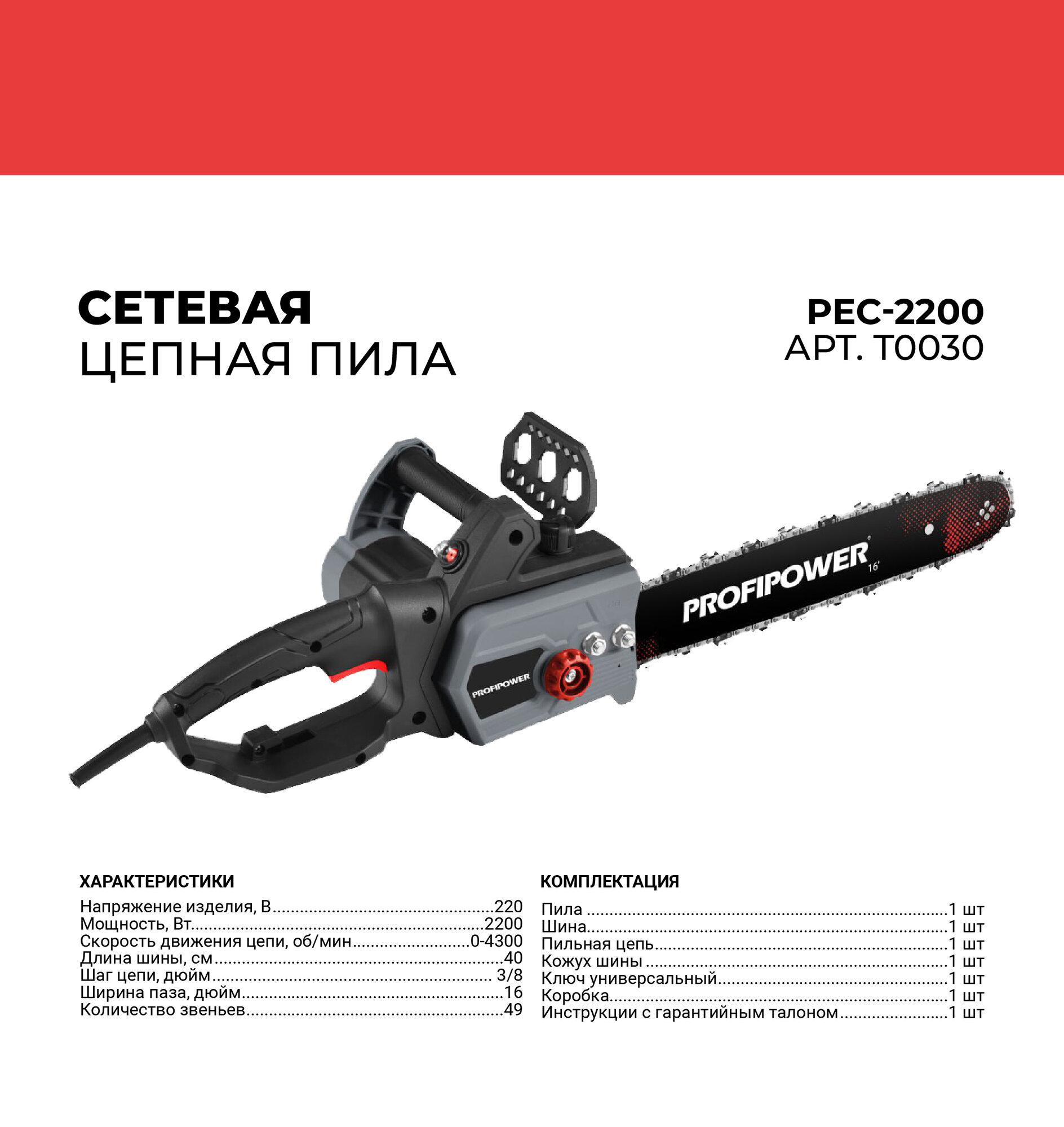 Купить Пила цепная сетевая ProfiPower PEC-2200, 2200Вт, шина 40 см, 3/8 шаг, 4300 об/мин