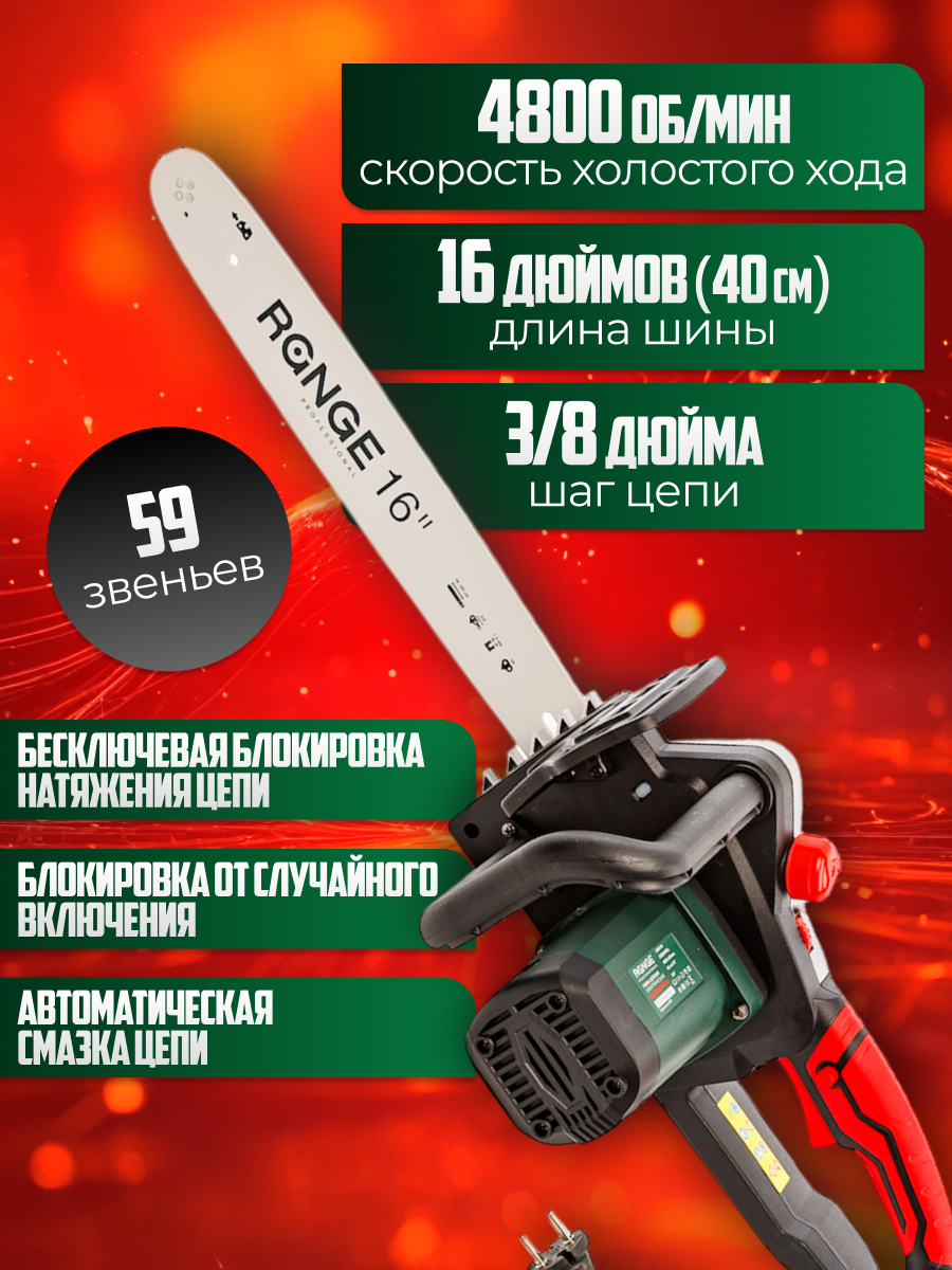 Пила цепная электрическая Range RECS2300-PRO 2300Вт, 4800 oб/мин, 16", 59звеньев интересное: