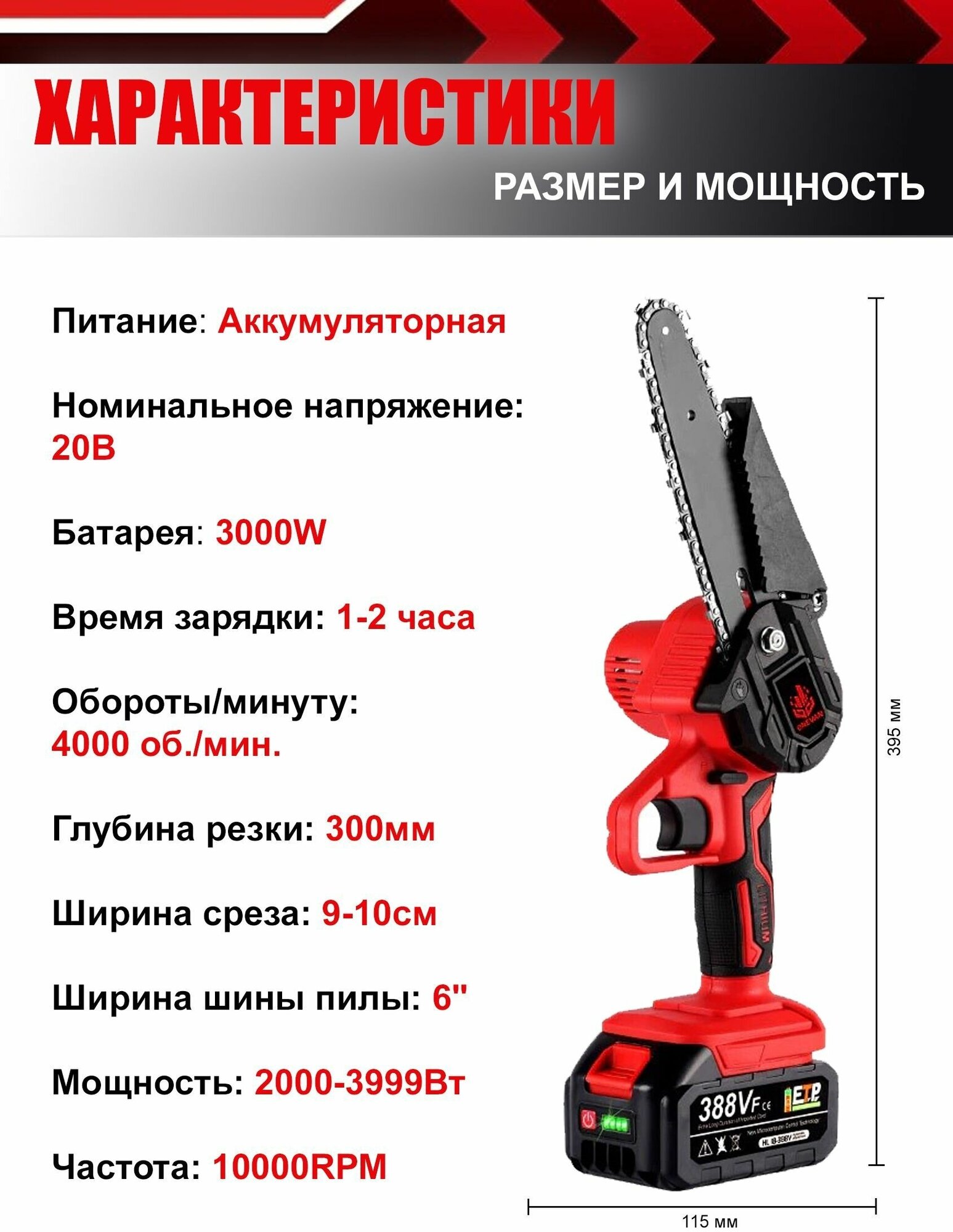 Пила аккумуляторная цепная 6 дюймов, кусторез 21В, 1500 Вт, 2000 об/мин, 2 АКБ, 3000mAh интересное: