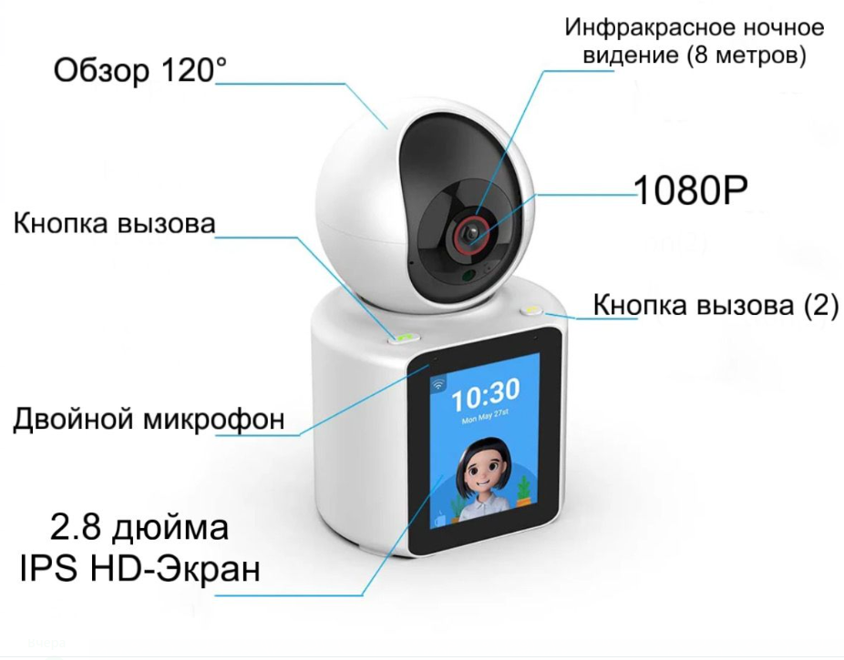 | Комплектация | Экран: IPS 2.8" HD; Количество ядер процессора: 2; Двойная цифровая микрофонная решетка; Расстояние аудио приема 4 м; Рабочая влажность до 80%; Поддержка карт памяти MicroSD до 128 ГБ; |