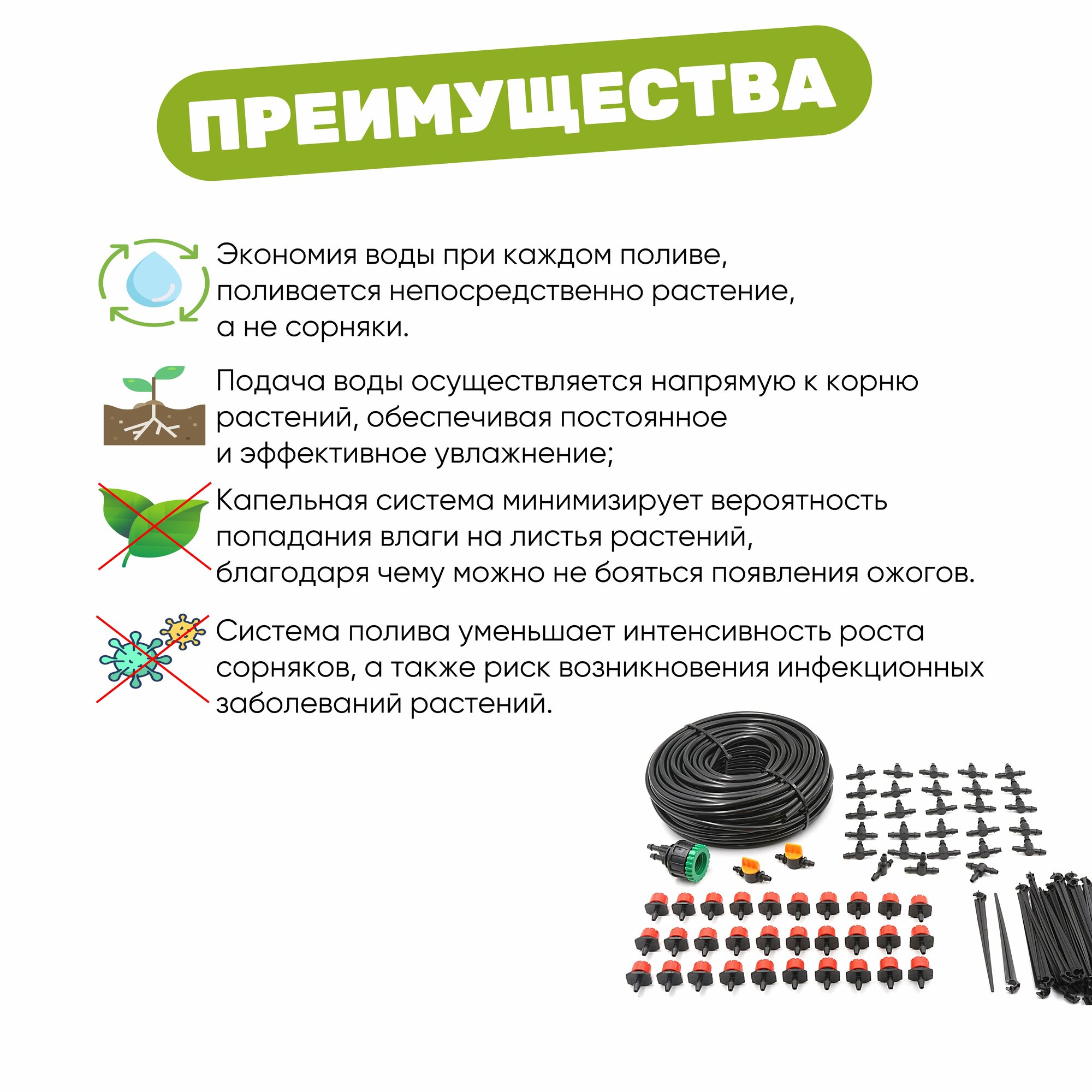| Комплектация | Система капельного полива на 30 растений с регулируемыми капельницами |