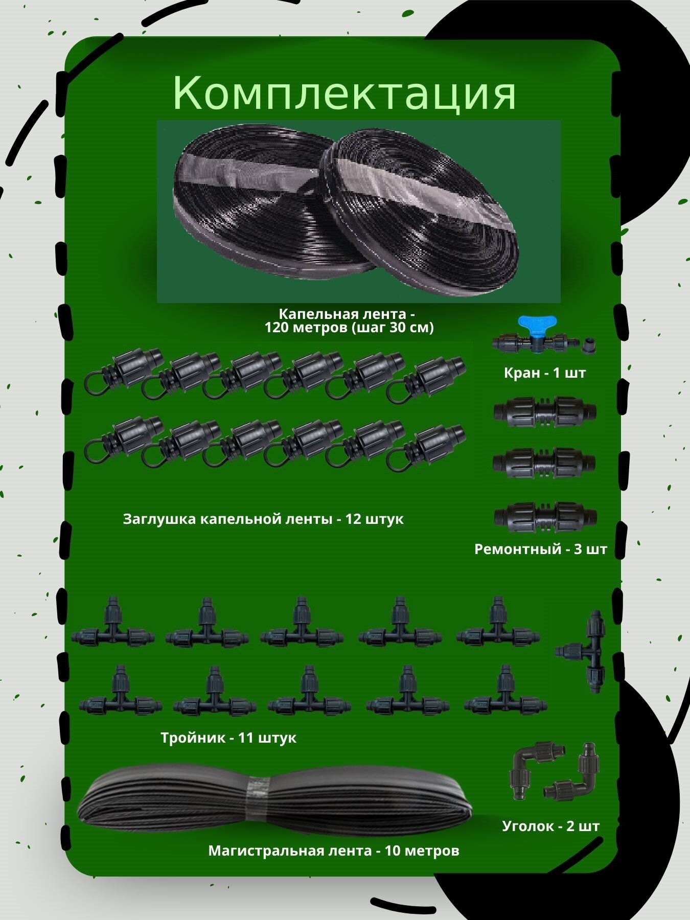 Капельный полив для теплицы и открытого грунта на 120 метров, шаг 30 см