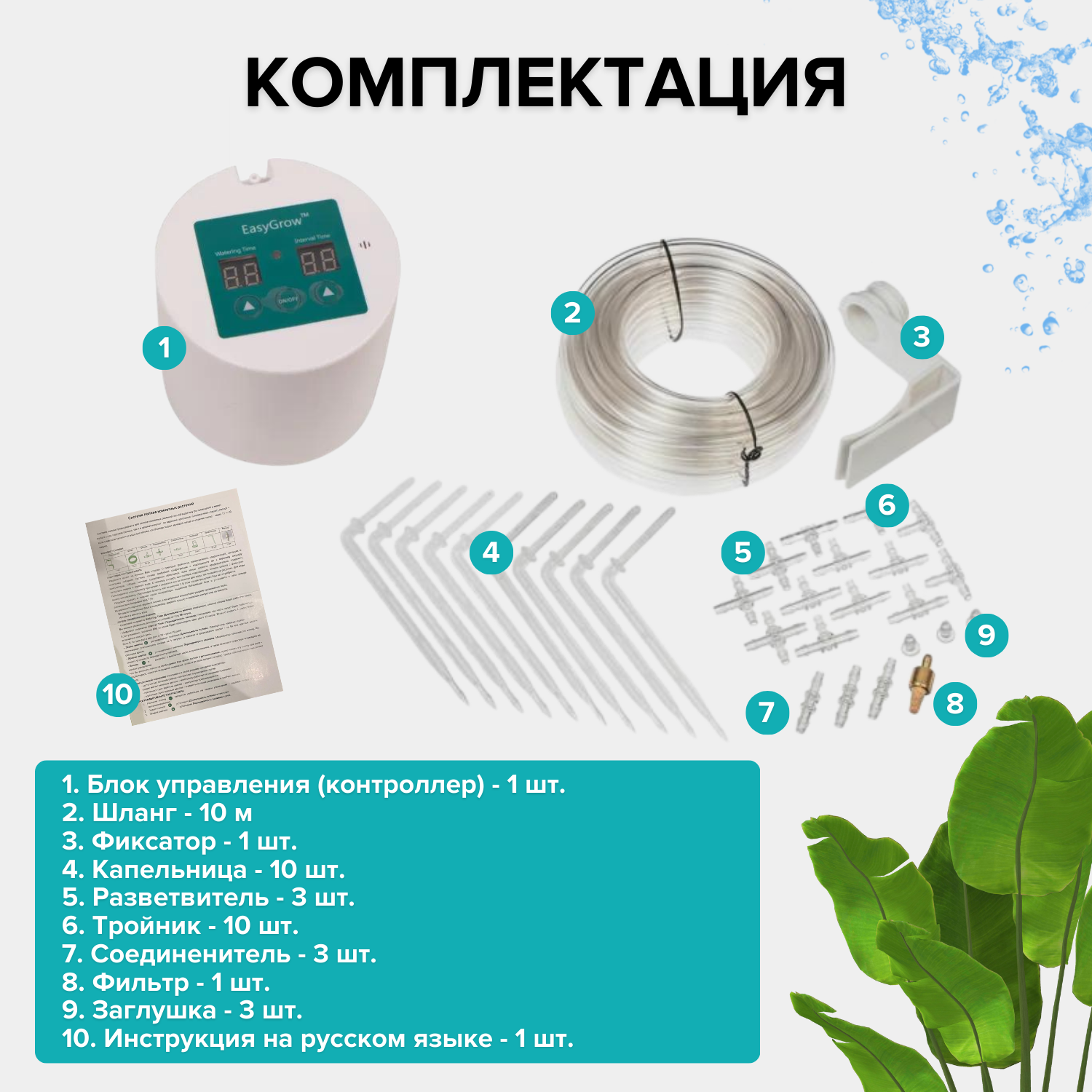 | Комплектация | Контроллер (таймер) - 1 шт.; Шланг - 20 метров; Фильтр - 1 шт.; Тройник - 15 шт.; Разветвитель - 3 шт.; Соединитель шланга - 3 шт.; Капельница - 15 шт.; Заглушка - 3 шт.; Блок питания - 1 шт.; Инструкция по эксплуатации - 1 шт.; Упаковка - 1 шт. |