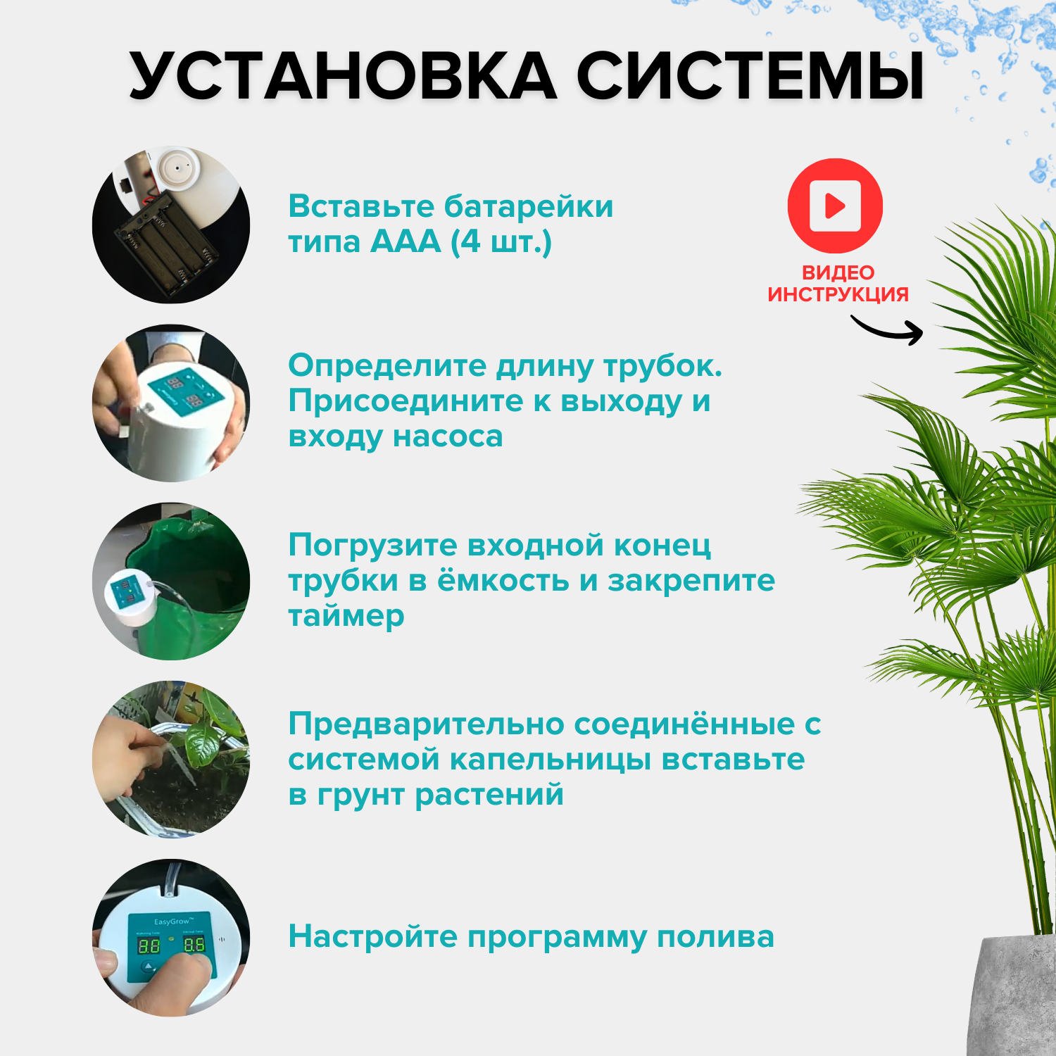 | Дополнительная информация | Предостережение: не рекомендуется добавлять в воду удобрения, которые могут привести к засору системы мелкими частицами, что повлияет на корректную ее работу. |