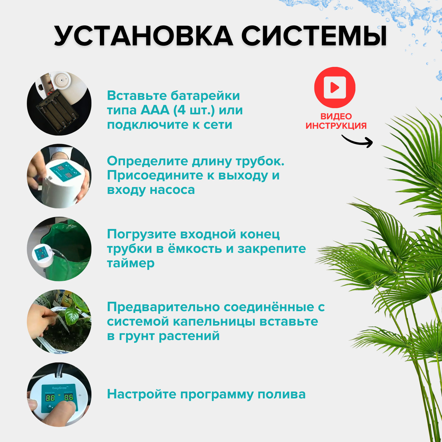 | Дополнительная информация | Предостережение: не рекомендуется добавлять в воду удобрения, которые могут привести к засору системы мелкими частицами, что повлияет на корректную ее работу. |